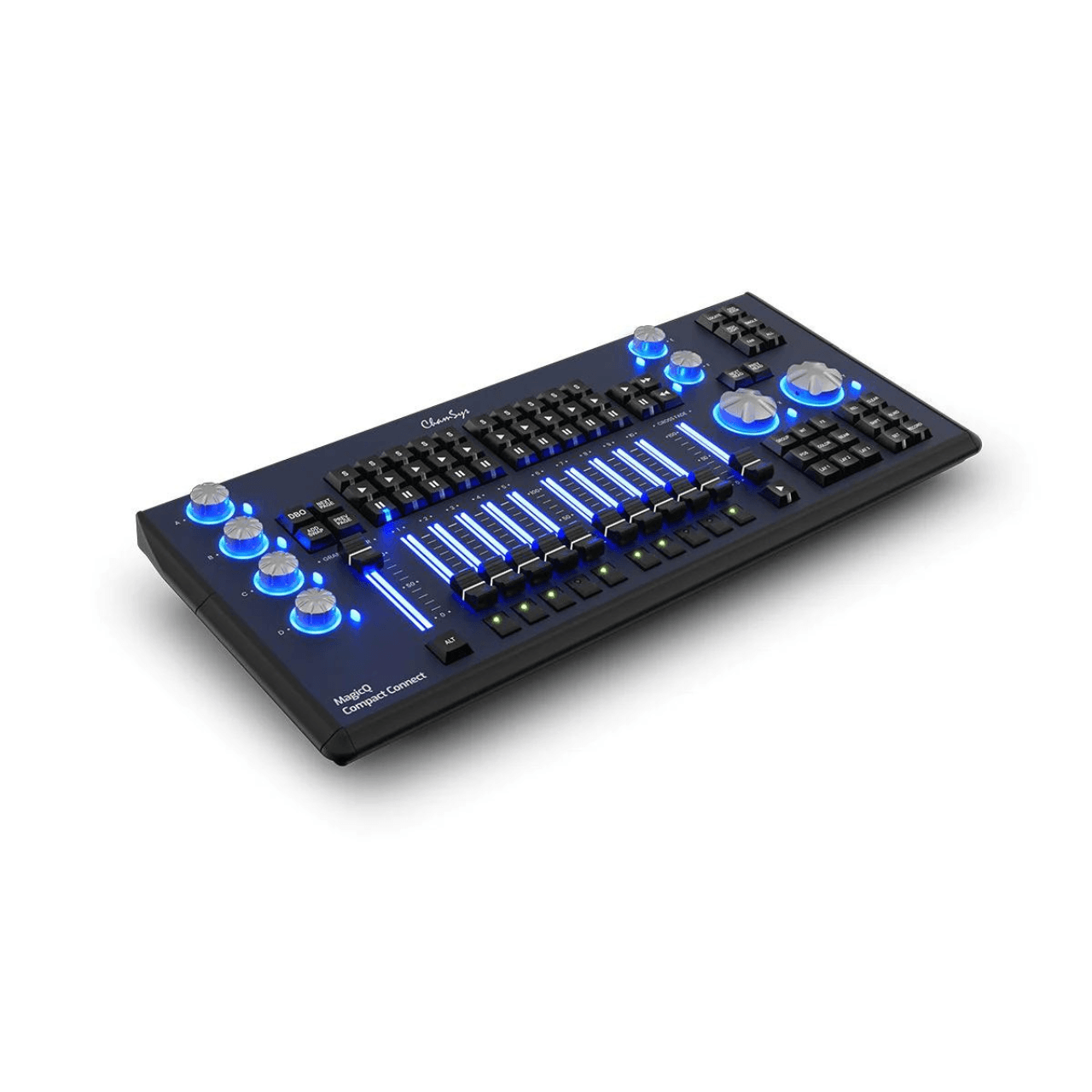 The MagicQ Compact Connect is a lightweight USB control surface that connects to your PC or Mac to control lighting, media, and LEDs.