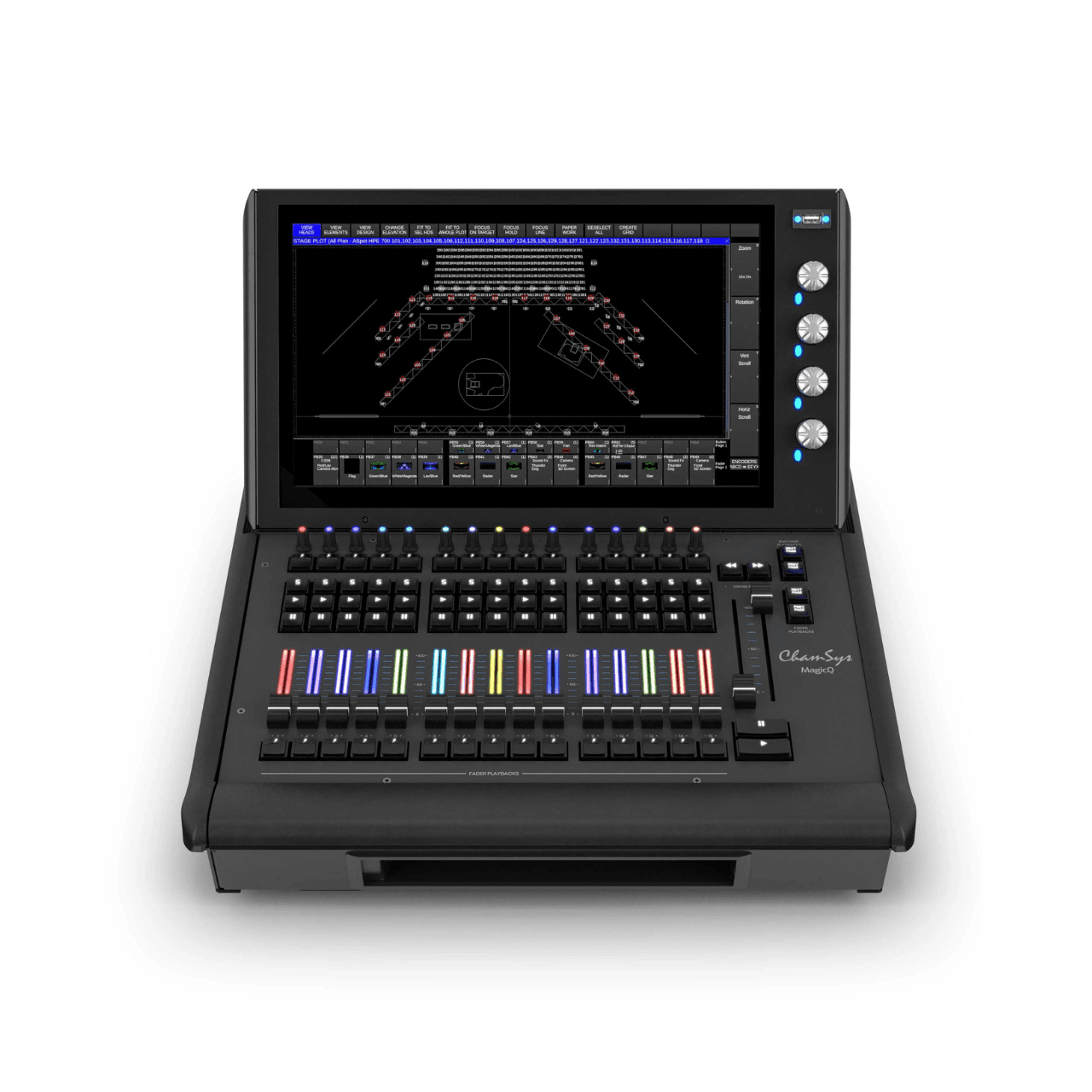 Playback encoders can control cue stacks of their own, or be tied to the fader playback below, or even control a whole bank of playbacks, or a whole page of playbacks.