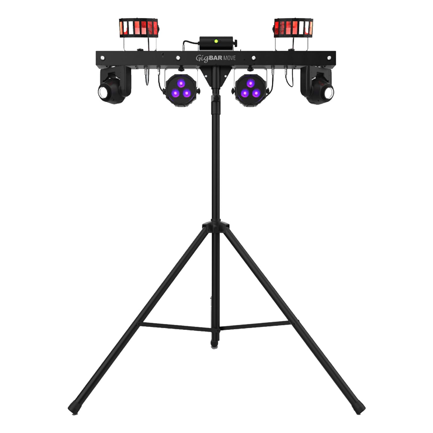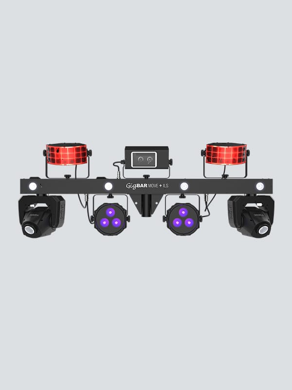 - 5-in-1 lighting system that includes moving heads, derbies, washes, a laser and strobe effect pre-mounted on a single bar