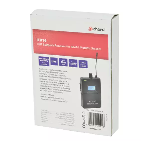 Additional or replacement beltpack for the Chord IEM16 UHF in-ear monitoring system. Supplied with professional quality in-ear headphones. Unlimited beltpacks can be used to receive the signal from a single IET16 transmitter, making the IEM16 system expandable and useful for performing groups, lectures, conference translation and many other applications.