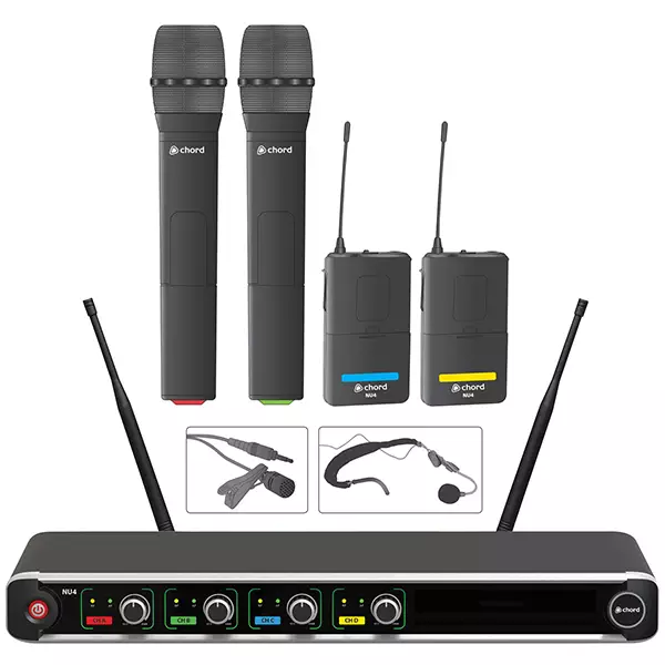 UHF wireless system with 4 independent channels. The receiver is 19″ rack-mountable and features 4 separate XLR outputs or a mixed jack output. Available in sets with 4 handheld or 4 beltpack transmitters (with a choice of neckband or lavalier microphone for each beltpack) or a combo set with 2 of each. Suitable for vocal groups, theatres and presentations.