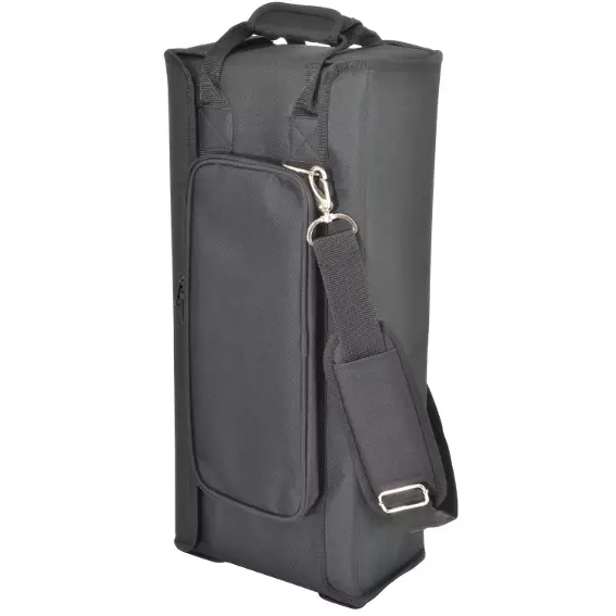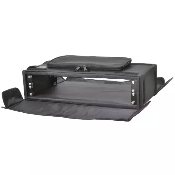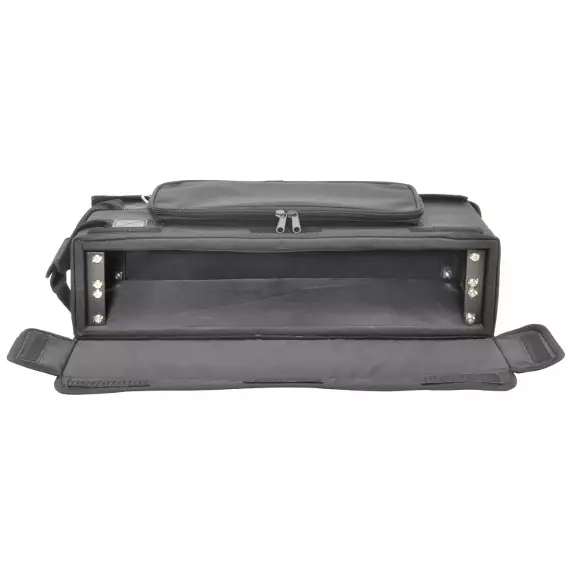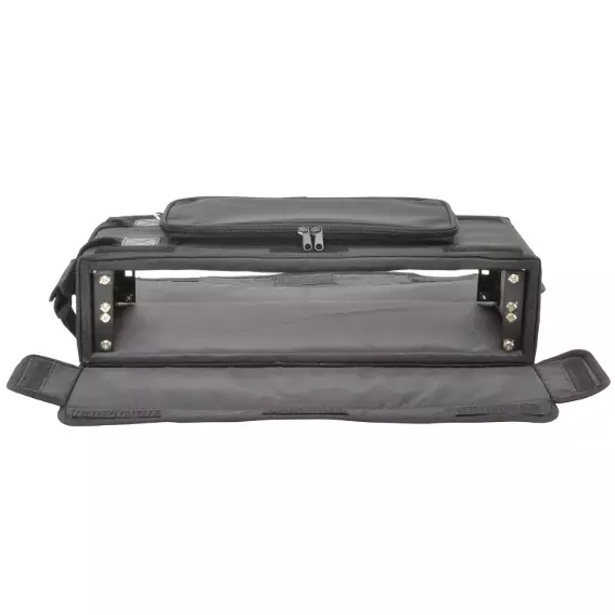 19″ rack case in a padded bag with front and rear flaps for access and ventilation. Equipment is protected by an inner wooden frame and secured by metal rack strip front and rear. Also fitted with carrying handle, shoulder strap and zipped outer pocket.