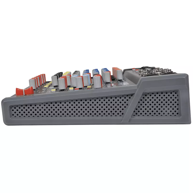Fully featured audio mixer with 4 mono input channels, a stereo line input, stereo Aux input and a further minijack stereo input. Each mono mic/line channel has a combo XLR/jack input with +48V phantom power switchable in pairs for the XLR inputs. Each mic/line channel has a Gain control for matching the input source and a low-cut switch to filter out rumble or handling noise from microphones. Each mono channel also has High/Mid/Low EQ controls, Aux out level, FX level and Pan control. The onboard foot-switchable DSP effects engine has 99 presets for delay, reverb and modulation effects, each of which can be adjusted using two parameter controls. An onboard Bluetooth receiver has an illuminated pairing button and independent volume control. The USB type-A port on the top panel is for playback of audio files or can be used to record the main outputs to a USB storage device or as an external audio device when connected to a laptop. Main output is served by left & right XLR, in addition to 6.3mm monitor and headphone outputs and the Aux send & stereo return loop. The CMB-series offers large console features in a more manageable format for live performers and project studio recordists.