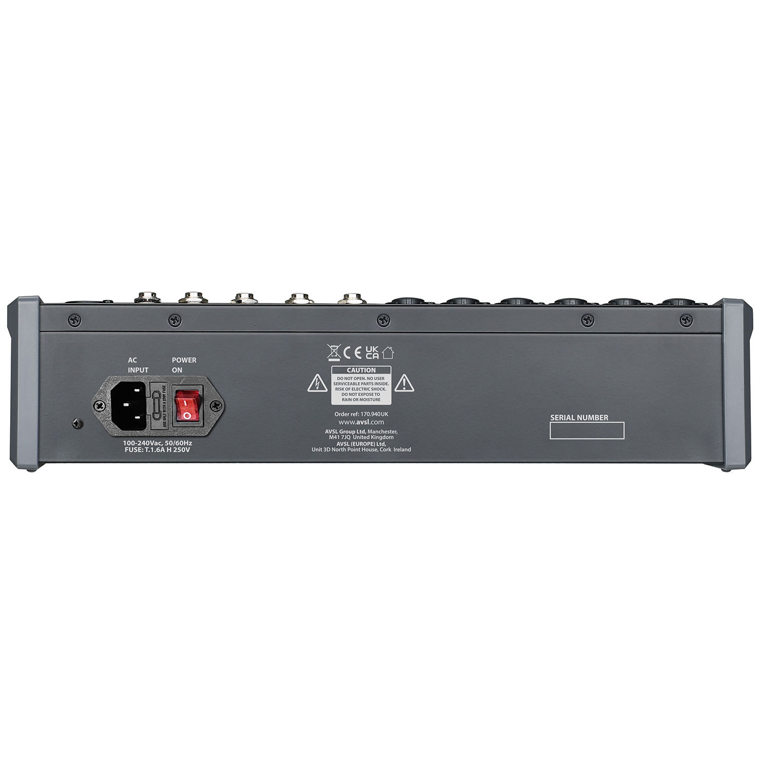 Fully featured audio mixer with 6, 8, or 10 mono input channels, 2 stereo line inputs, stereo Aux input and a further minijack stereo input. Each mono mic/line channel has a combo XLR/jack input with +48V phantom power switchable in pairs for the XLR inputs. Each mic/line channel has a Gain control for matching the input source and a low-cut switch to filter out rumble or handling noise from microphones. Each mono channel also has High/Mid/Low EQ controls, Aux out level, FX level, Pan control and a 60mm channel fader. The onboard foot-switchable DSP effects engine has 99 presets for delay, reverb and modulation effects, each of which can be adjusted using two parameter controls. An onboard Bluetooth receiver has an illuminated pairing button and independent volume control. The USB type-A port on the top panel is for playback of audio files or can be used to record the main outputs to a USB storage device or as an external audio device when connected to a laptop. Main output is served by left & right XLR, in addition to 6.3mm monitor and headphone outputs and the Aux send & stereo return loop. The CMC-series is a comprehensively equipped mixing console for live sound engineers, project studios, and entertainment venue installations.