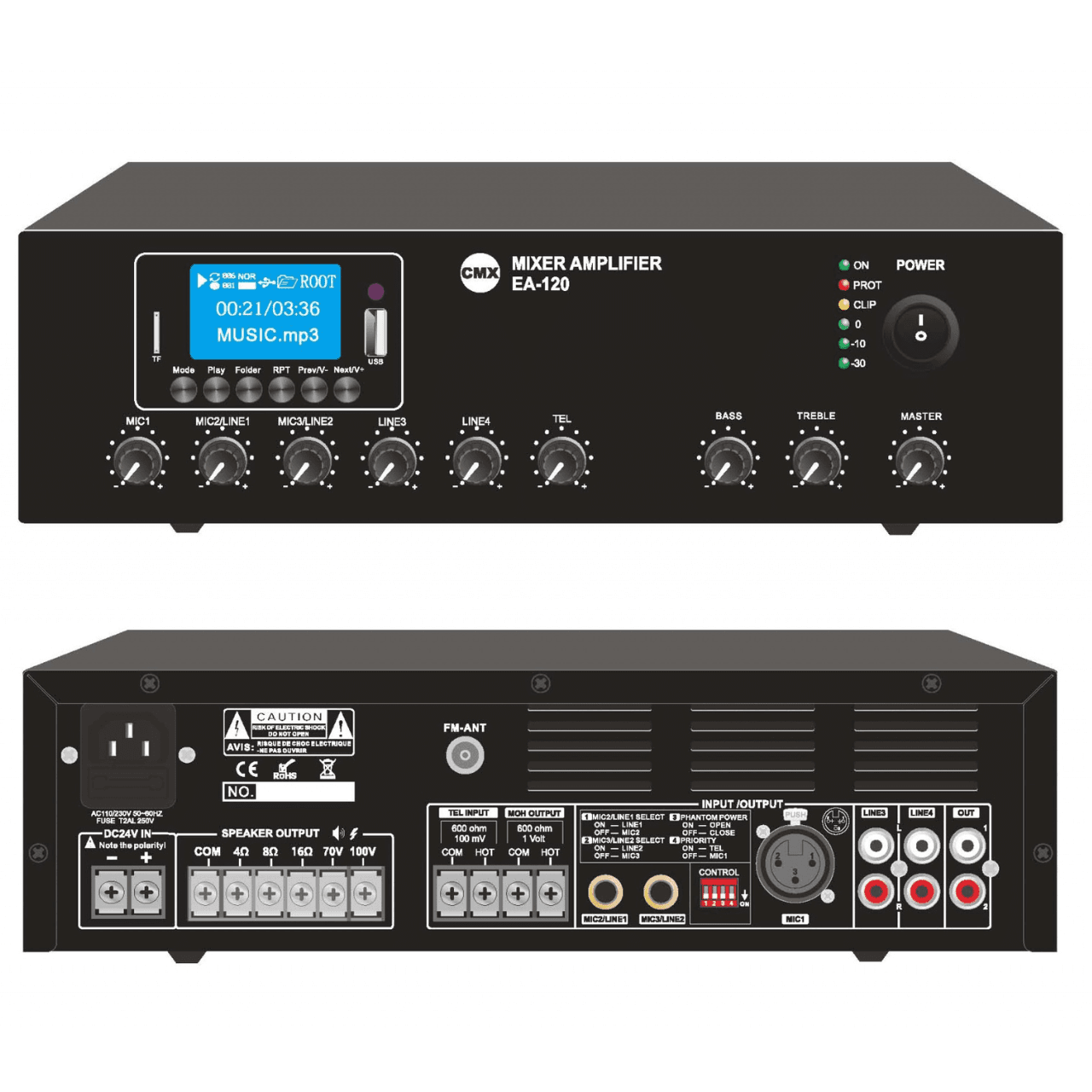 - Speaker output of 100V or 70V & 4 Ohm-8 Ohm-16 Ohm