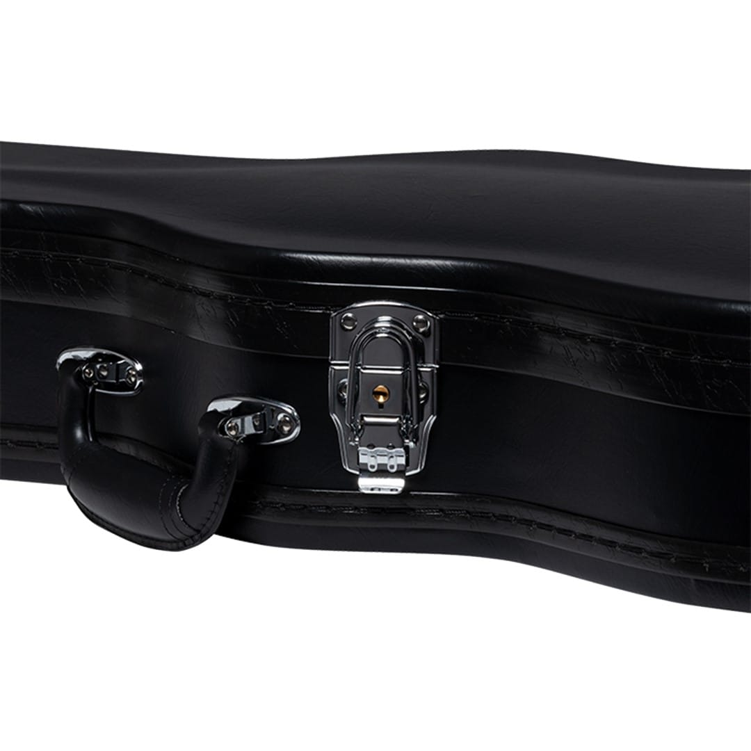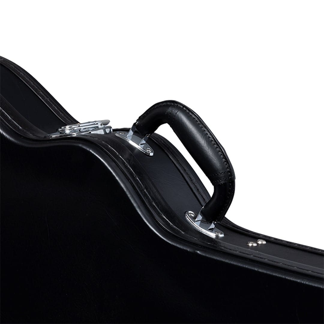 Inside, the plush grey lining gently cushions your guitar, preventing scratches and protecting its finish. The built-in accessory compartment provides a convenient place to store strings, picks, and other essentials. Four heavy-duty latches keep the case securely closed, delivering peace of mind while traveling.