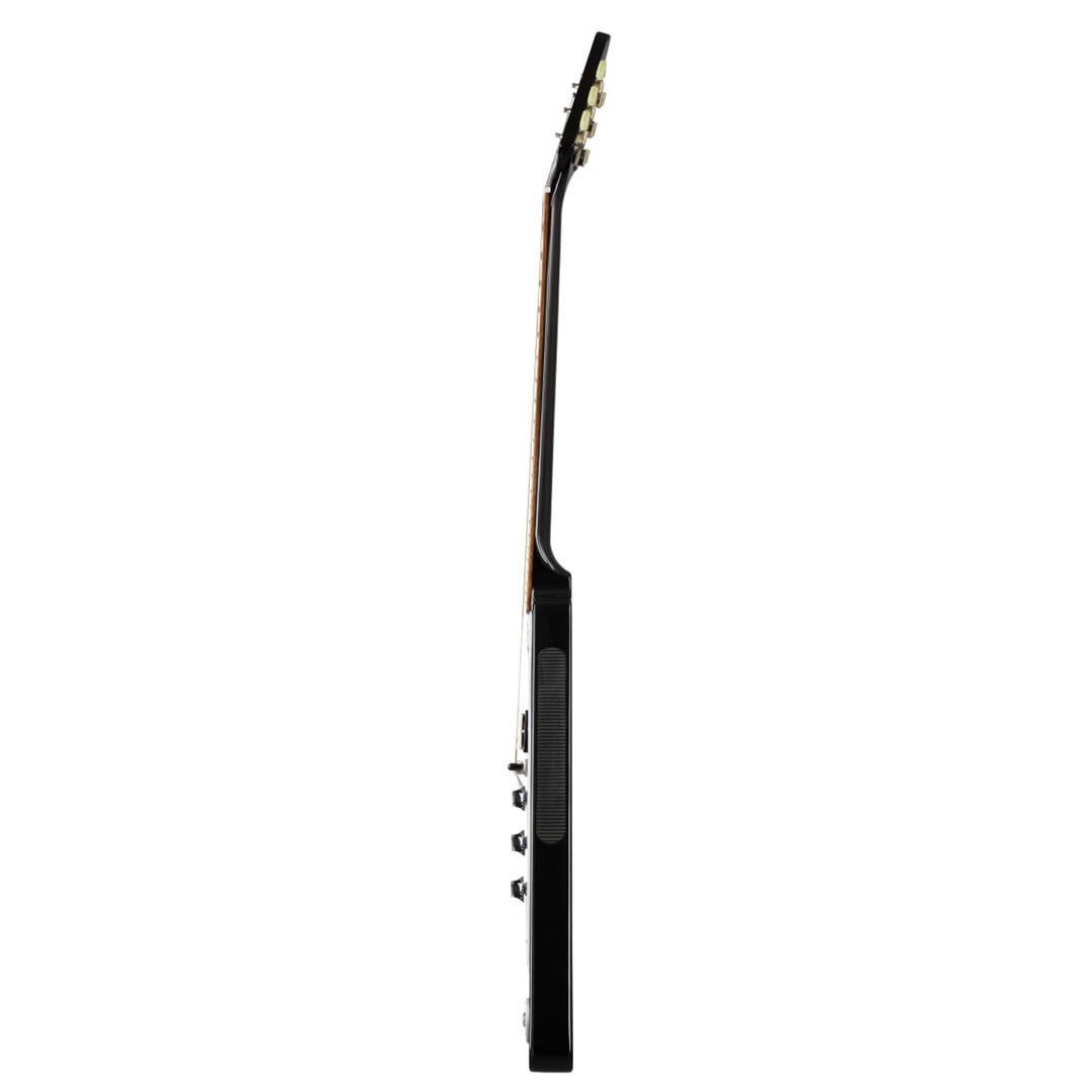 The Epiphone EIFV-EB Flying V Ebony, part of the Inspired by Gibsonâ„¢ Collection, brings the iconic 1958 design to modern players. This guitar features a sleek Flying V body shape with a glossy Ebony finish. Crafted from mahogany, it delivers rich, warm tones, while the slimTaper C-profile neck offers a comfortable playing experience. With a scale length of 24.75 inches and a 12-inch fingerboard radius, it provides smooth playability and effortless string bending. The fingerboard, made from laurel, is adorned with 22 medium jumbo frets and dot inlays, enhancing its vintage appeal.
