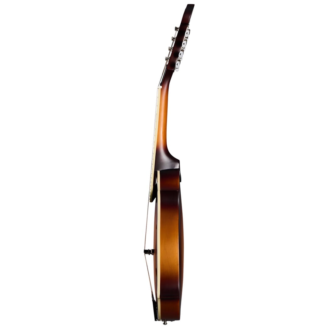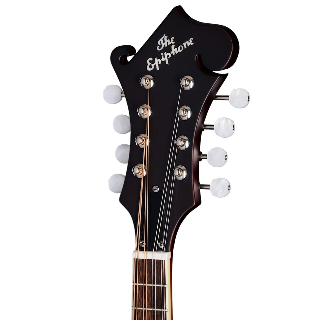 The Epiphone EIGMF5S-VSS F-5 Studio Vintage Sunburst Satin mandolin blends traditional craftsmanship with modern playability. Its all-solid wood construction features a solid Sitka spruce top and solid maple back and sides. These materials ensure a rich, resonant tone that suits various musical styles. The maple neck, glued to the body with a dovetail joint, adds stability and improves sound quality.
