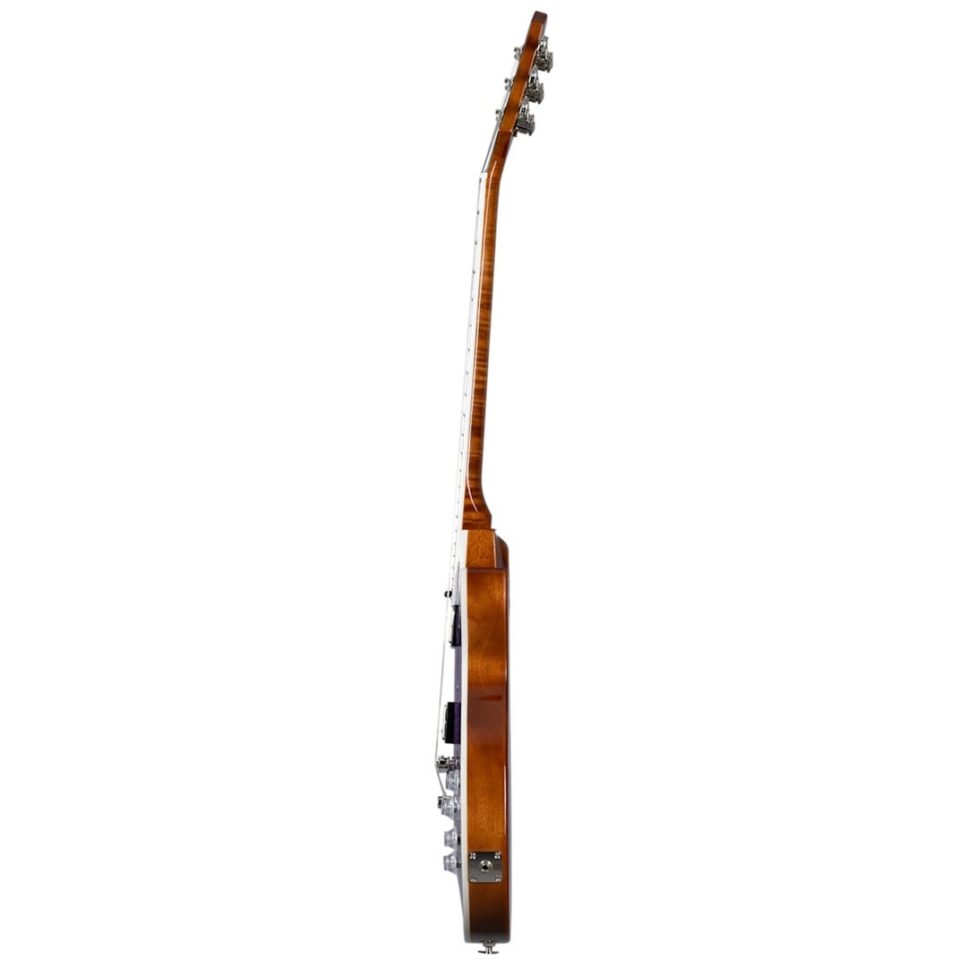 The Epiphone EILM-PRB Les Paul Modern Figured Purple Burst reimagines the iconic Les Paul design with modern features. It features a weight-relieved mahogany body with a maple top and AAA flame maple veneer, delivering both stunning looks and rich tone. The asymmetrical SlimTaper mahogany neck offers a comfortable playing experience, while the ebony fingerboard with trapezoid inlays adds a touch of elegance. Equipped with ProBucker 2 and 3 pickups, this guitar provides versatile sound options, including coil splitting and phase switching. Additional features like Grover Locking Rotomatic tuners, a LockTone Tune-O-Matic bridge, and a Stop Bar tailpiece enhance tuning stability and sustain. A premium gig bag is included for added protection.