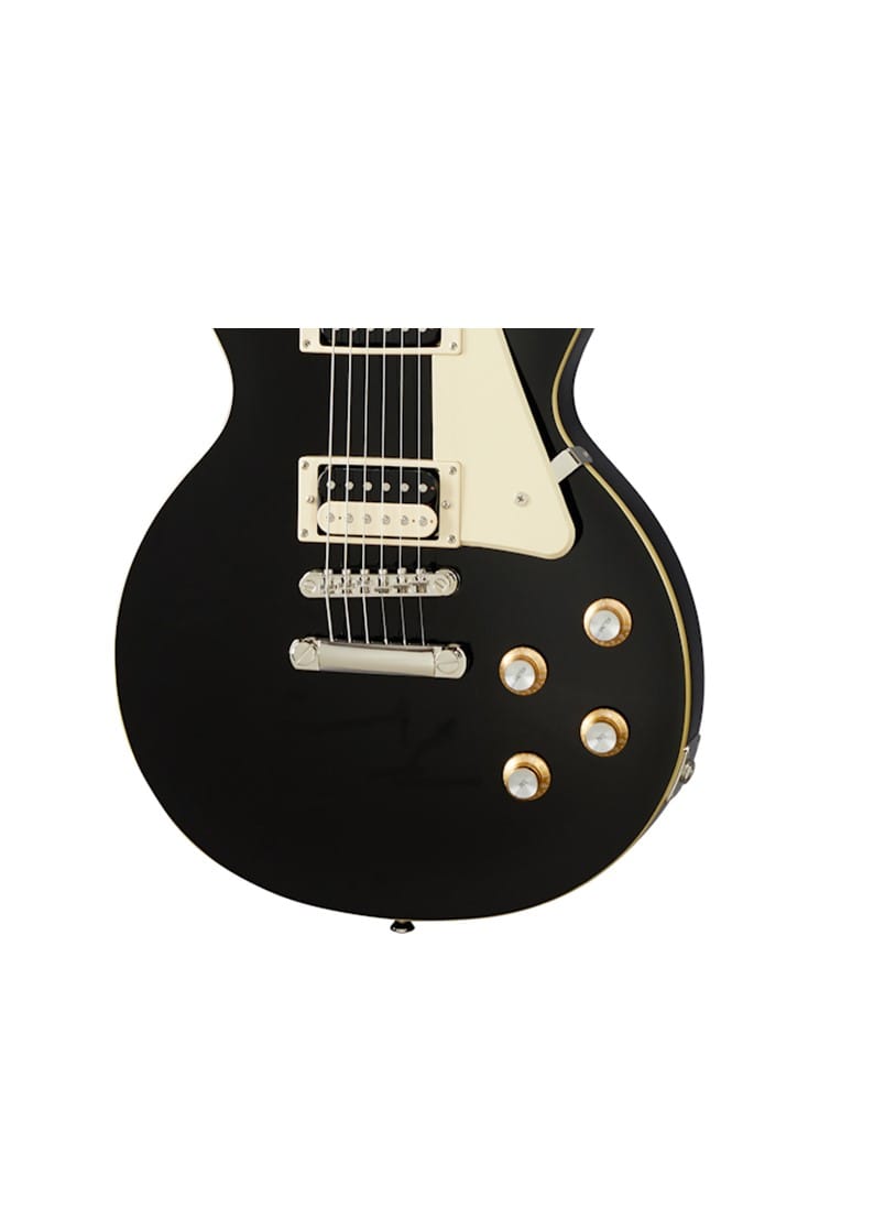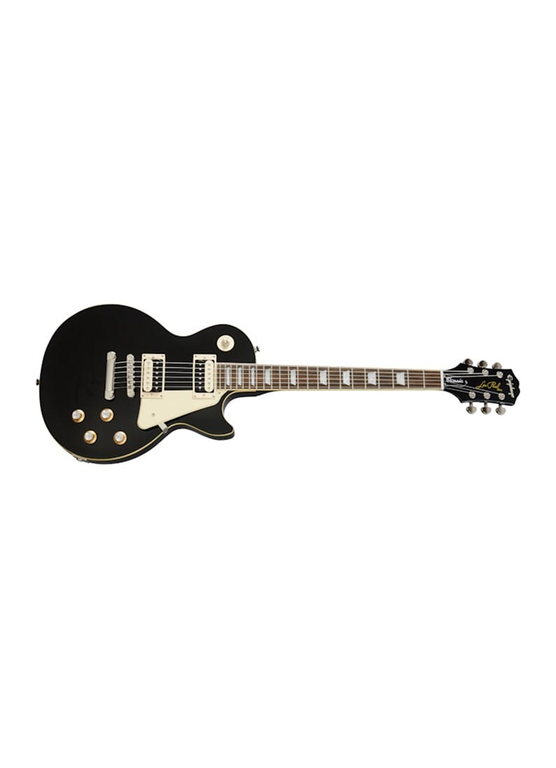 Classic Design and Build: The Epiphone Les Paul Classic in Ebony mirrors the iconic late 1950s Les Paul Standard. It features a solid mahogany body with a plain maple top, delivering rich, warm tones and a sharp top-end clarity. The guitar’s gloss body finish and classic color contribute to its timeless appeal.