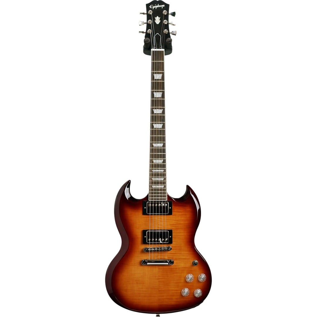 The Epiphone EISMF-HBF SG Modern Figured Honey Burst Fade brings a fresh twist to a legendary guitar design. Its mahogany body features a 3/4" AAA flame maple top that adds tone and visual appeal. The SlimTaperâ„¢ mahogany neck with a contoured heel offers smooth access to upper frets. Players will enjoy the fast feel of the ebony fingerboard and its 24 medium jumbo frets.