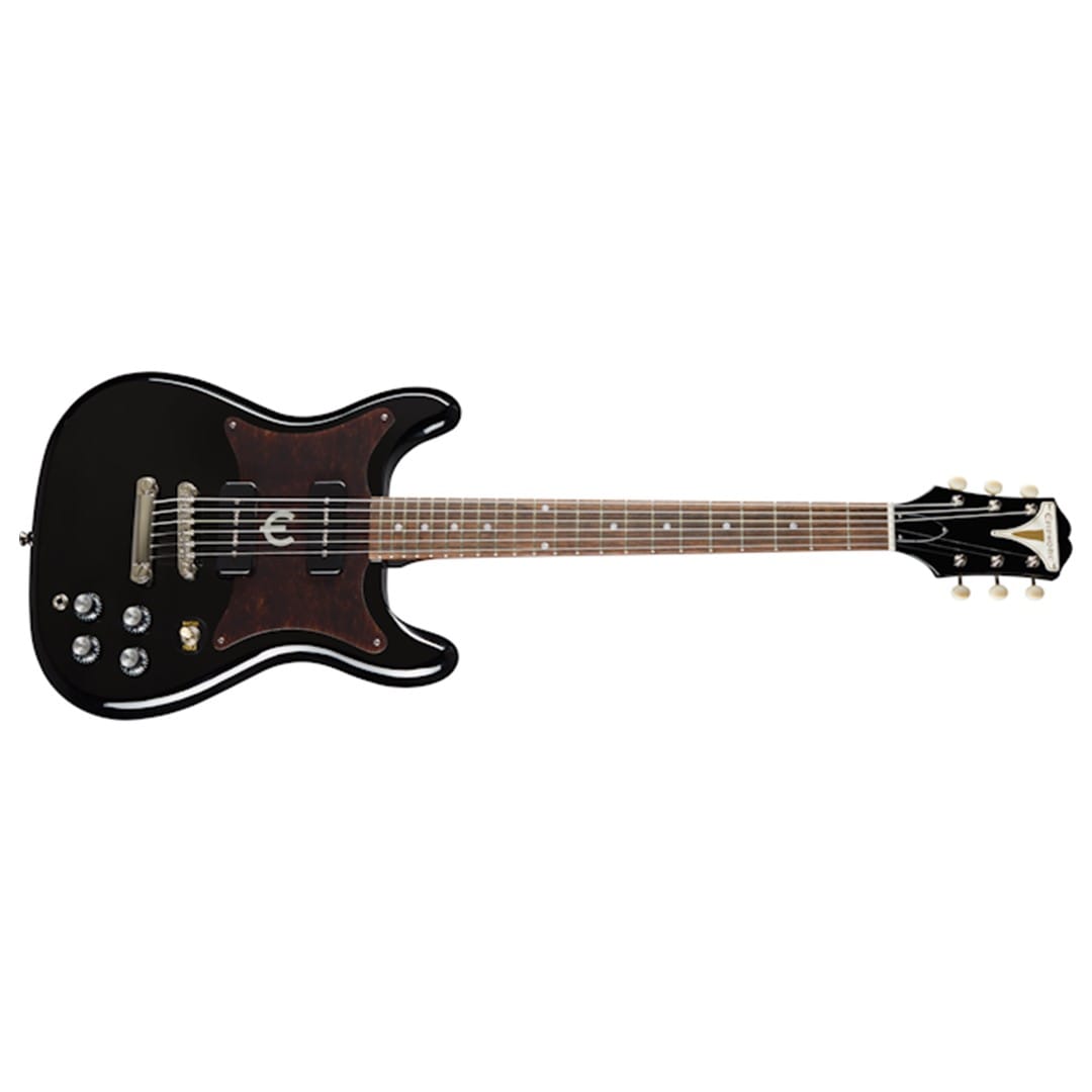 The Epiphone EOWL-EB Wilshire P-90 Ebony revives the classic 1959 design with a symmetrical double-cutaway mahogany body, PRO P-90 Soapbar pickups, and modern playability. Featuring a medium C profile neck and LockTone™ Tune-O-Matic™ bridge, it offers a perfect blend of vintage aesthetics and contemporary performance.