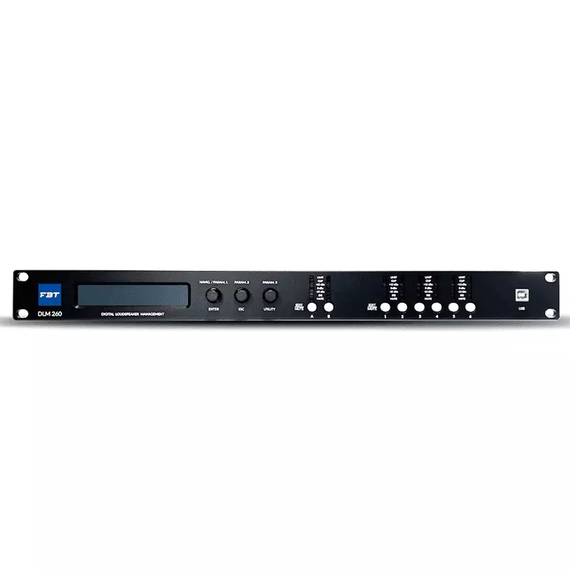 The DLM 260 is a DSP based 2 inputs x6 output digital loudspeaker management processor, ideally suited for fixed installation and live events. The front panel control with LCD display offers users an intuitive interface designed for ease of use and efficiency. The menu system allows for seamless navigation through various settings and options, providing users with a user-friendly experience. When it comes to networking options for DLM 260, users can choose between Ethernet or RS 485 for larger systems. It combines the functions of many conventional products in a compact 1 U unit with extensive PC remote control capabilities. Routing is freely assignable from the two inputs to the six outputs. Input-output equalization is available with a choice of 16 filter options.
