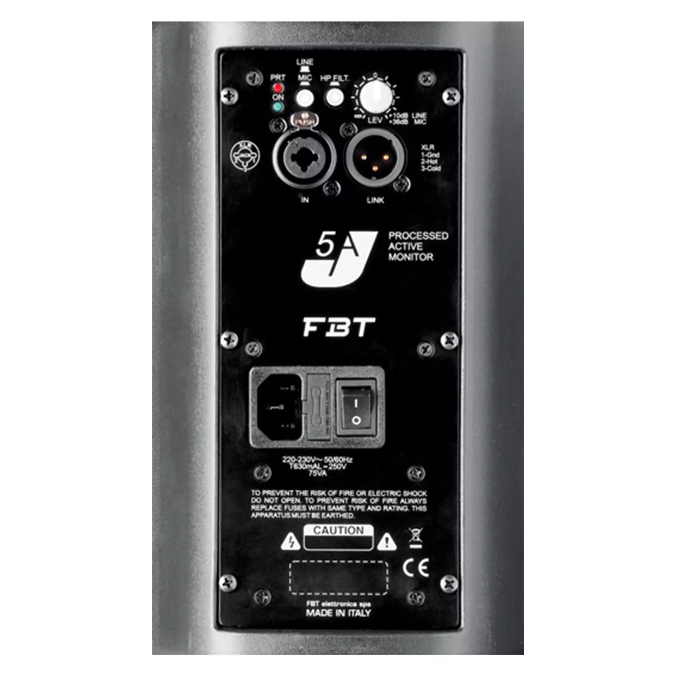 The bi-amplified FBT J5A active speaker feature a 80W RMS low frequency amp and a 40W RMS high frequency amp. The control panel features a level control, HP filter switch, mic/line selector, led power on, protection led indicator, a balanced Neutrik input combo-jack, balanced XLR link out.