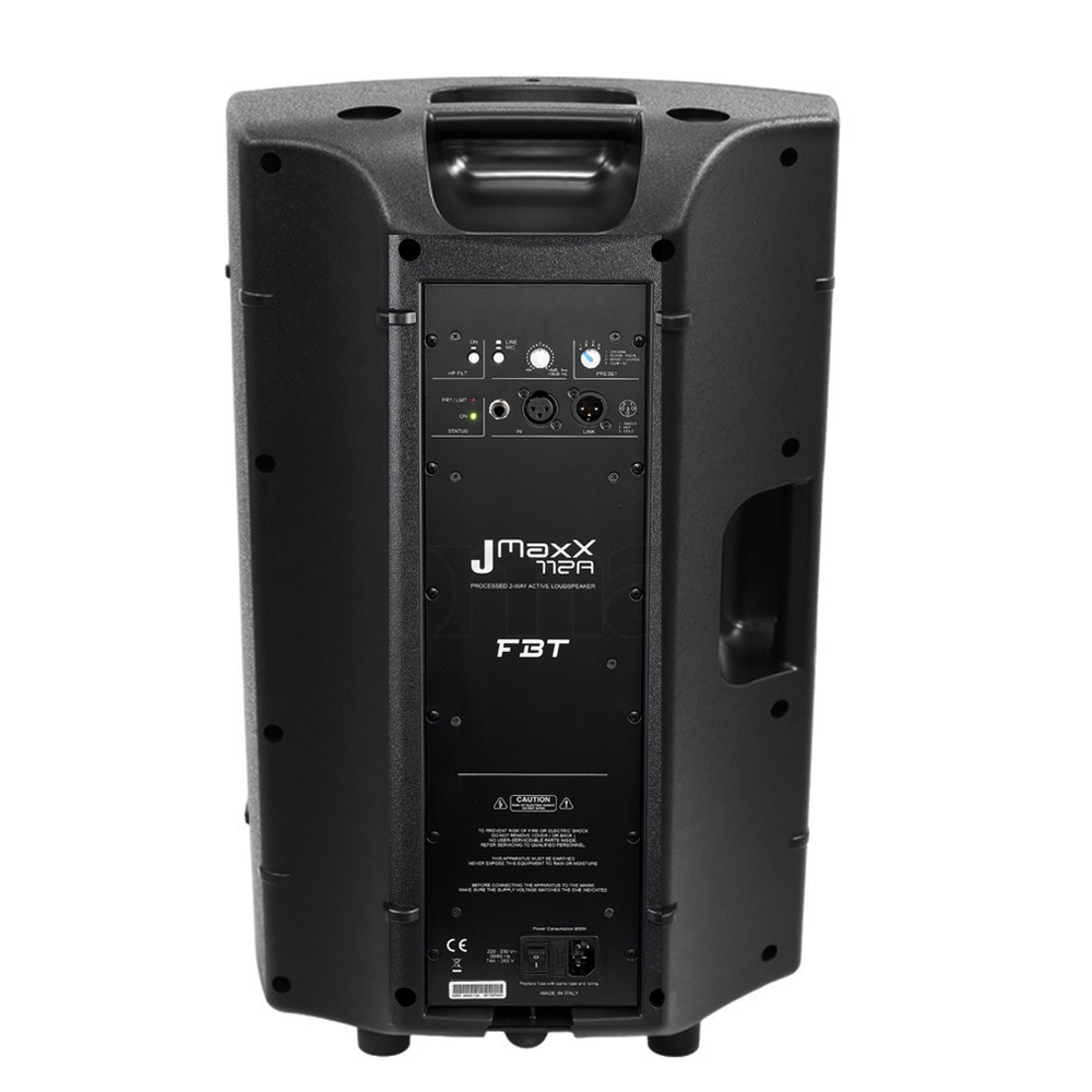 The new FBT JMaxX 112A combines ease of use and versatility for many portable or installed sound applications: musicians, DJs, AVL contractors, rental sound reinforcement, corporate events, houses of worship, bars and clubs. With its eye-catching gas-injected forms designed to virtually eliminate undesired enclosure resonance and reinforce strong low frequency performance, the 12-inch JMaxX 112A is equipped with FBT’s latest 90° x 60° HF horn design which delivers improved projection, accuracy, and dispersion of the mid and high frequencies. Providing a myriad of possibilities for bands, DJs and solo artists, as well as for permanent installations, the JMaxX 112A is actually four loudspeakers in one. Derived from a decade of experience of portable sound reinforcement, the carefully tailored equalization presets offer highly intelligible response for vocals and floor monitoring; slightly boosted response in lounge bar applications; punchy and forward sound for DJs and night venues; and a general-purpose EQ setting that mirrors the original and familiar FBTMaxX voicing. The JMaxX 112A features FBT’s latest generation lightweight 700W + 200W Class D power amplifier with universal switch mode power supply, delivering abundant power and headroom to reproduce even the largest transients without distortion. XLR inputs and outputs, volume control, the EQ presets and filters, and ground lift switch are all conveniently located on a clearly laid out rear panel, making loudspeaker setup and operation intuitive and consistently repeatable. The JMaxX versatility is further underscored by the many mounting and fixing options that the ergonomically styled cabinets provide. Mounting in fixed installations is made easy using the M10 suspension points or wall bracket flange plates, while portable use is facilitated by the built-in 35mm pole mount socket. There’s no need for separate stage monitors, as JMaxX’s cabinet profiles are designed with 12°, 40°, and 55° wedge angles, and when used with the specific floor monitoring EQ presets, will ensure that performers hear themselves with ultimate clarity. Weighing just 13.8 Kg and yest still packing a genuine 900 Watts RMS The JMaxX 112A is a winning combination of performance in an ultra lightweight package.