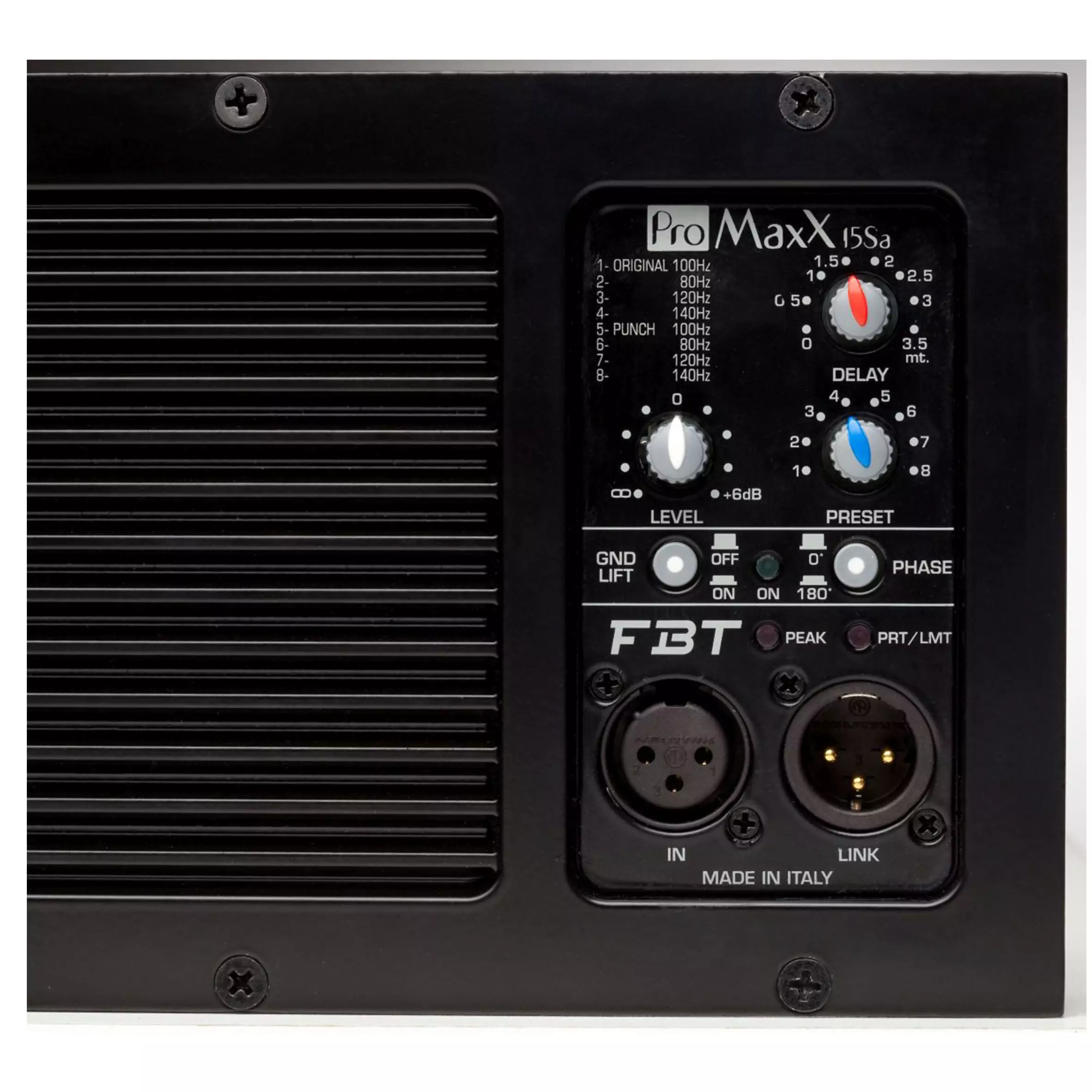 The FBT ProMaxX 15SA, 15″ compact band-pass subwoofer is the perfect low-frequency extension for the ProMaxX range. The FBT ProMaxX 15SAshall meet the following performance criteria: Frequency response of 38Hz to 120Hz, Maximum SPL of 136dB peak, Class D 1200W RMS power amplifier with high efficiency switch mode power supply enclosed inside a thermally efficient lightweight aluminum die-cast chassis. The FBT ProMaxX 15SA provides a DSP with 8 presets, 2 equalization with 4 LPF different frequency. The FBT ProMaxX 15SA feature 0.59″ Baltic birch plywood construction covered in a scratch resistant black paint with M20 top-mounted stand adapter and two FBT design aluminium handles. The control panel provides XLR in & link, Volume control, EQ preset, Delay, phase switch 0°-180°, GND lift switch.