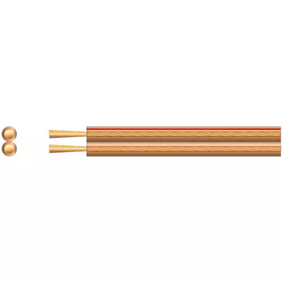 High quality 2 core flexible speaker cable in transparent sheath. Stranded conductors. Red polarity indicator.