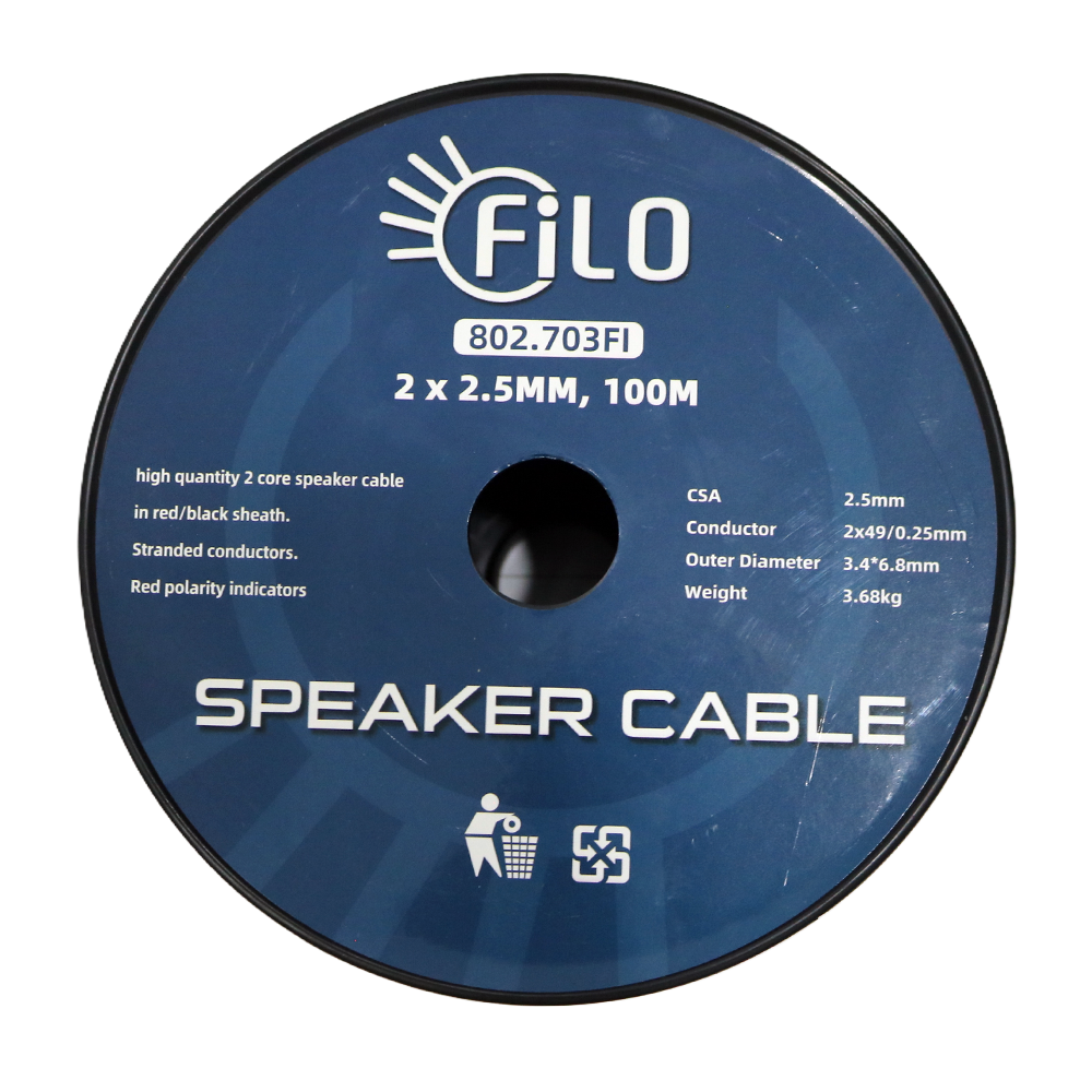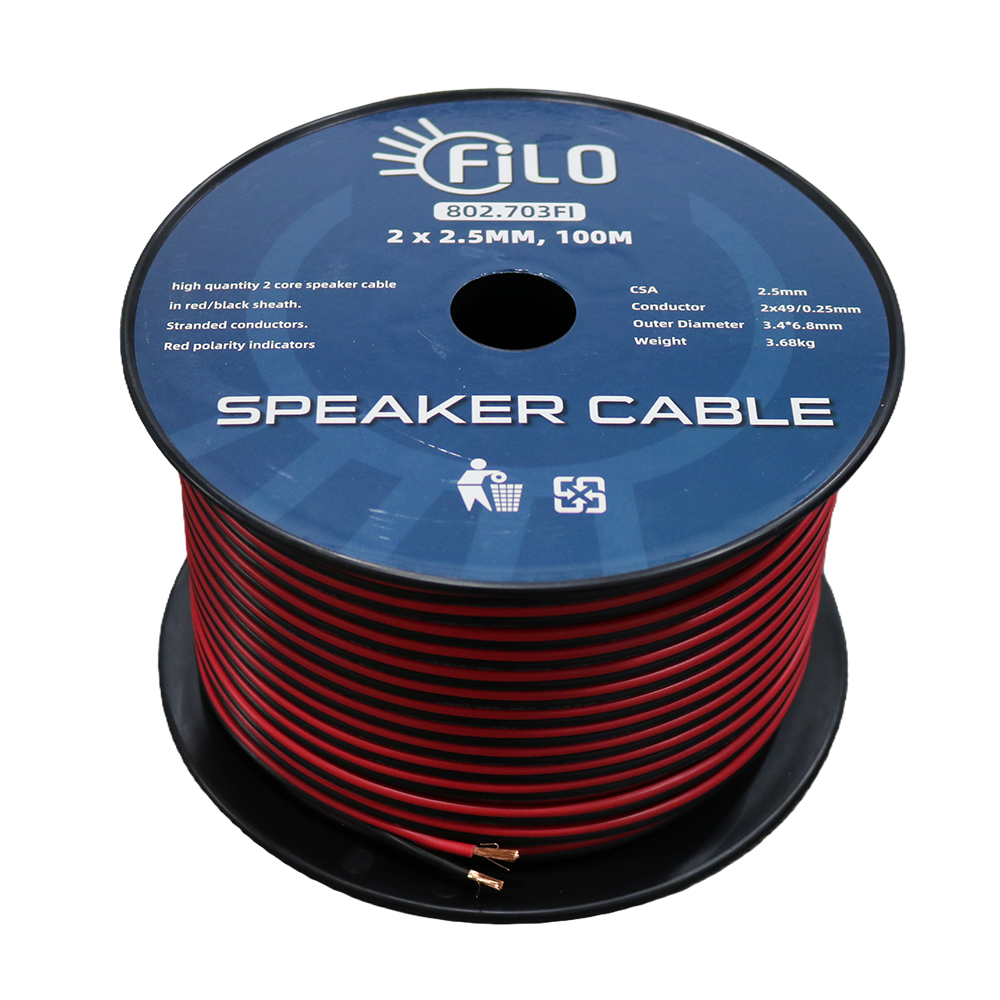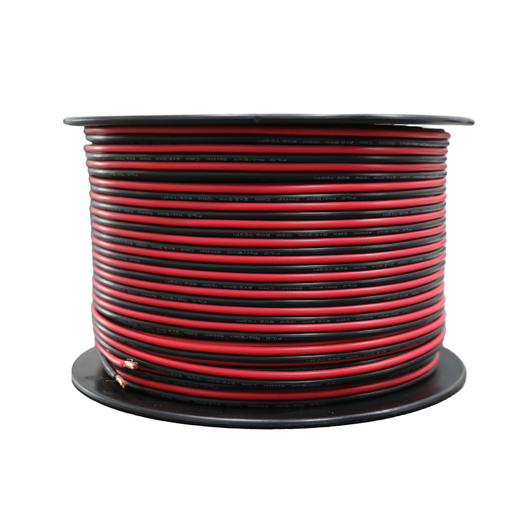 Flexible, heavy‑duty speaker cable designed with a blend of pure copper and CCA stranded conductors, featuring a clear polarity indicator for easy installation.