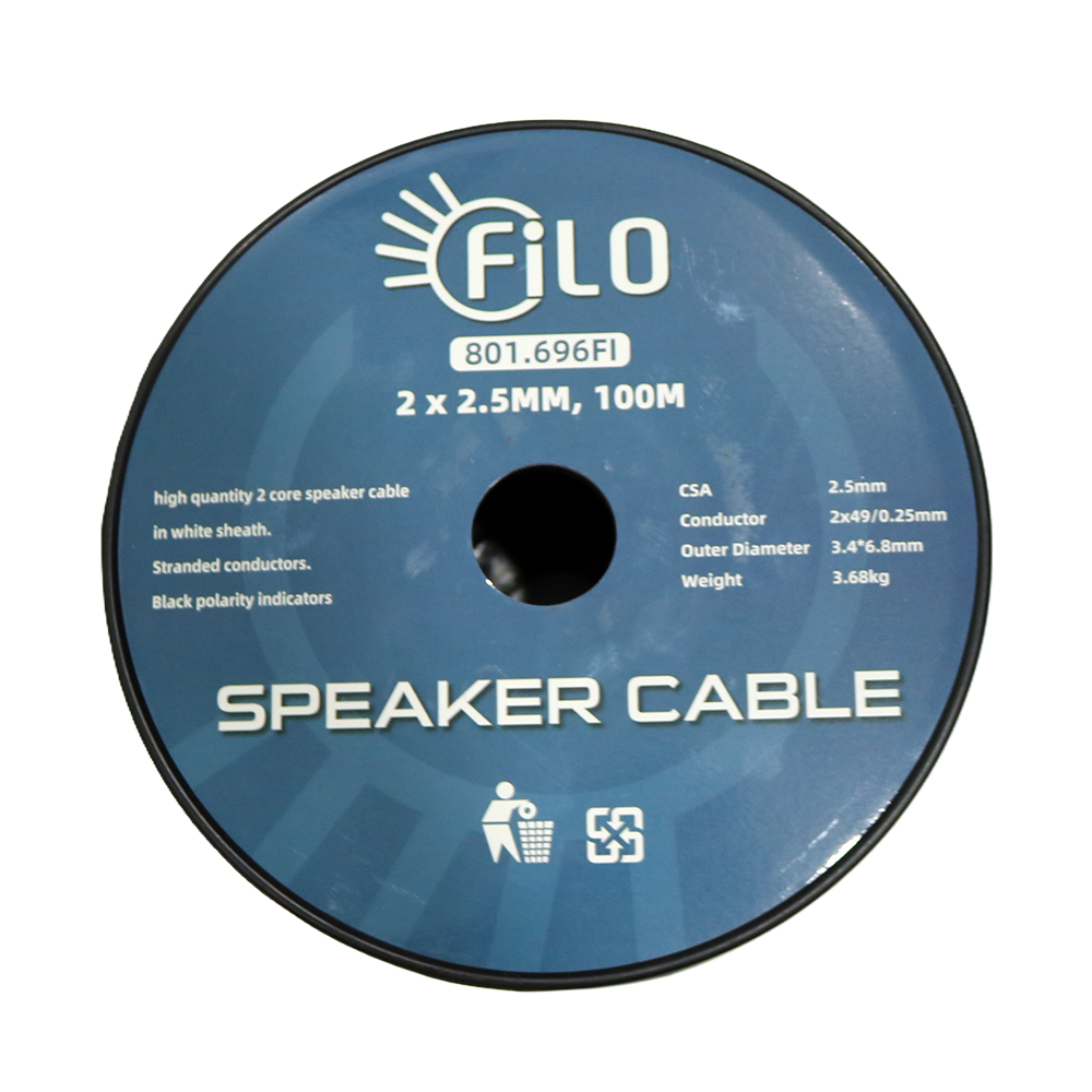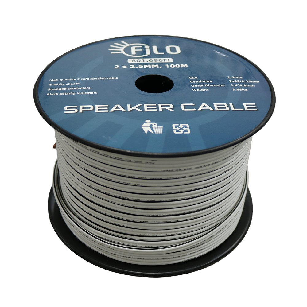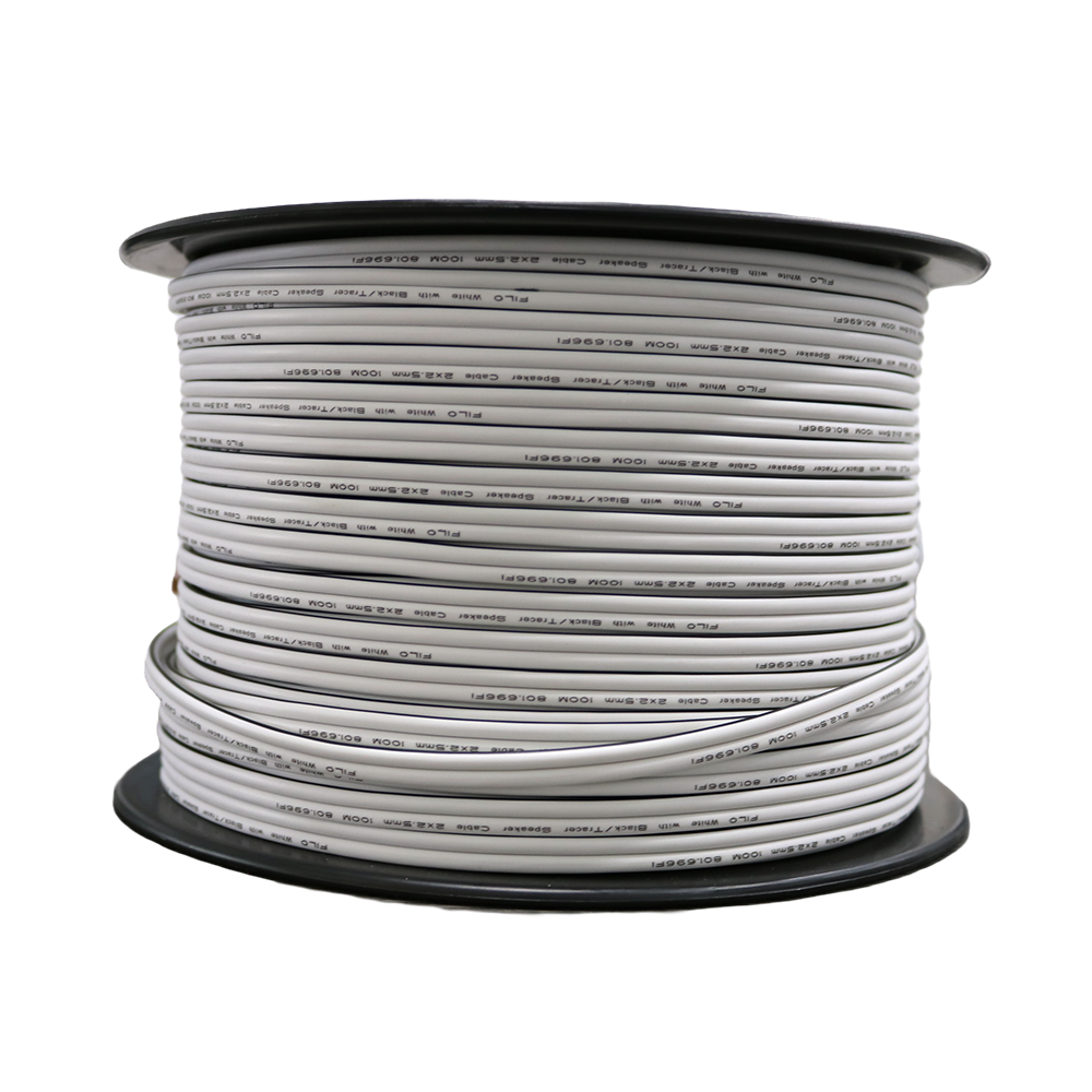 Flexible, heavy‑duty speaker cable designed with a blend of pure copper and CCA stranded conductors, featuring a clear polarity indicator for easy installation.