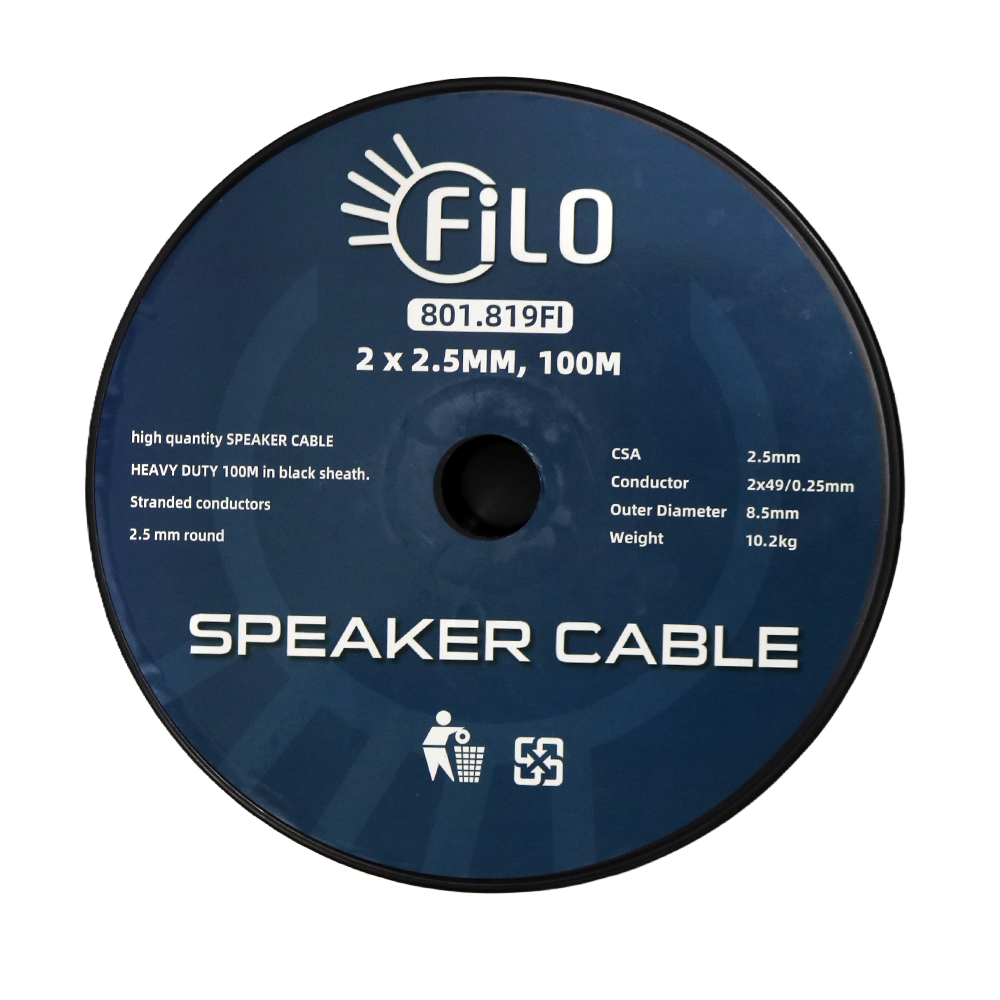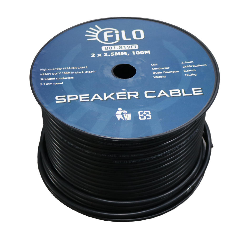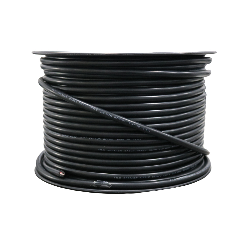 Flexible, round, heavy‑duty speaker cable designed with a blend of pure copper and CCA stranded conductors, featuring a clear polarity indicator for easy installation.