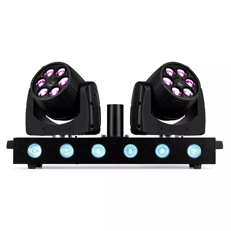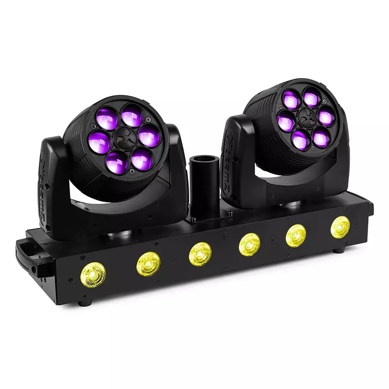 The Twin LED Moving Head Bar consists of 2 individual moving heads mounted on a sturdy metal T-bar that is also equipped with 6 high power RGBW LEDs. The two moving heads are equipped with 6x 12 RGBW LEDs and can be independently controlled via DMX, allowing you to tailor your lighting effects with unparalleled precision. In addition to DMX control, this fixture offers a range of automated features. Engage the various automatic programs to effortlessly transform your venue with captivating light patterns. For those who prefer a hands-free experience, the fixture includes a sound-to-light mode, syncing its movements and colours to the beat of the music, adding an extra layer of excitement to any event. Link multiple units together with P-Con and DMX in and outputs. The Twin LED Moving Head Bar can be mounted on a standard 35mm stand.