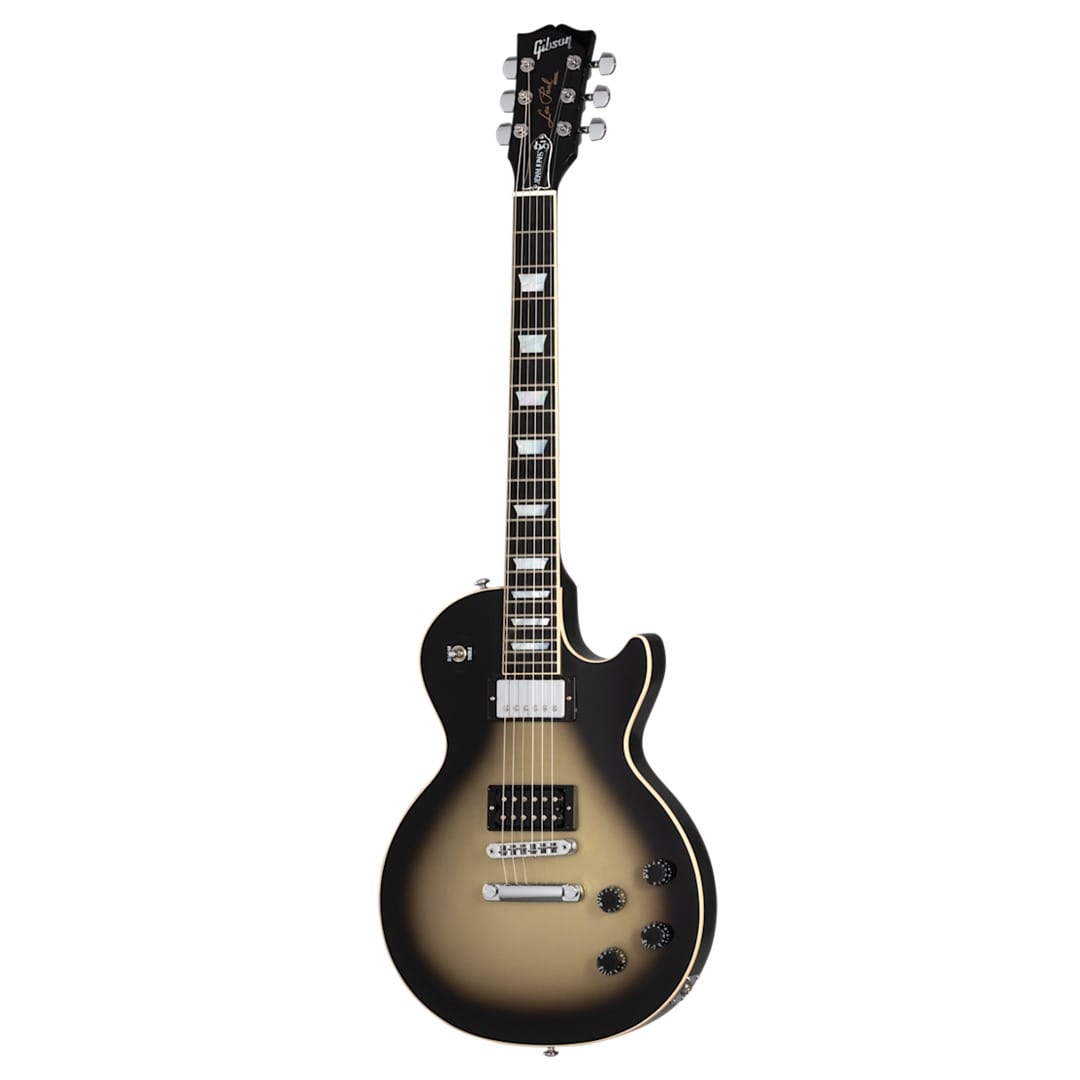 The Gibson LPS7PAJ00-AS L.Paul Std Adam Jones Antique Silverburst, a collaboration with Tool's guitarist Adam Jones, blends classic Les Paul features with modern innovations. The guitar boasts a mahogany body, maple top, and gloss nitrocellulose lacquer finish. Its mahogany neck offers a 70s rounded profile and volute for enhanced comfort. The ebony fingerboard, with a 12-inch radius and mother-of-pearl trapezoid inlays, completes the elegant design.