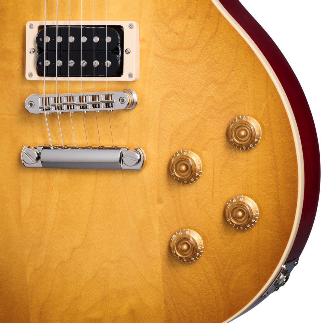 Equipped with Custom Burstbucker pickups, this Les Paul produces a powerful, dynamic sound. These pickups use Alnico 2 magnets and are hand-wired to Orange Drop capacitors, ensuring high-quality audio performance. The guitar’s Honey Burst finish with a Cherry Back closely resembles the vintage aesthetic of Slash’s original instrument. Additionally, the finish is applied using gloss nitrocellulose lacquer, which enhances the guitar’s appearance while maintaining its classic look.