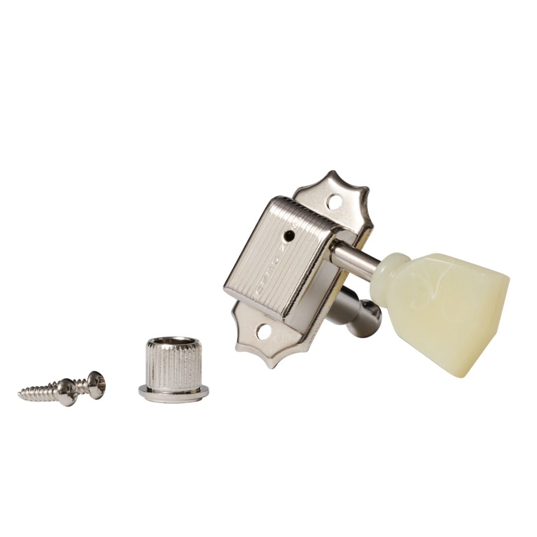 Upgrade your guitar with the Gibson PMMH-040 Kluson Deluxe Reissue-style Tuner Set in Nickel. These tuners replicate the classic design of Gibson’s vintage Les Paul machine heads from the 1950s. They are manufactured to the exact OEM specifications, ensuring both authenticity and high performance. The nickel finish gives these tuners a timeless look that enhances the classic appeal of any guitar headstock. Made with pearloid buttons, these tuners provide a touch of vintage elegance while maintaining modern functionality.