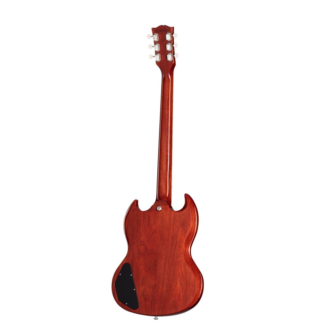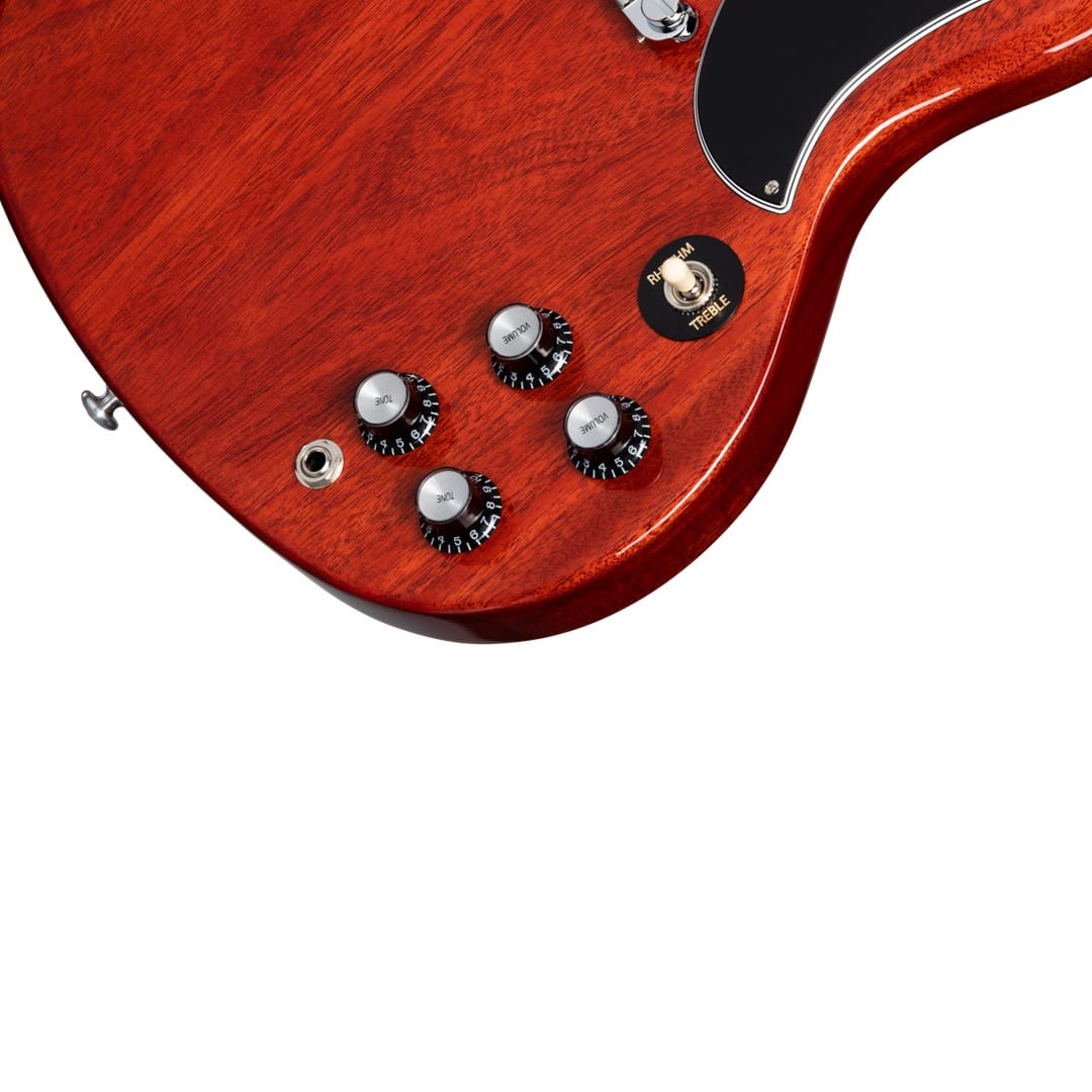The Gibson SGSP00-VE SG Special in Vintage Cherry embodies Gibson’s commitment to timeless quality and design. Its solid mahogany body, finished with gloss nitrocellulose lacquer, ensures durability and rich resonance. The SlimTaper mahogany neck and bound Indian rosewood fingerboard enable fast and effortless playability, making it ideal for versatile musical styles. Medium jumbo frets and a 12-inch fingerboard radius further enhance the playing experience.