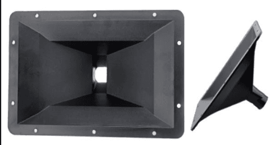 This plastic horn with flange is designed for use with compatible speaker units. It offers a durable and lightweight structure, ideal for various audio applications.