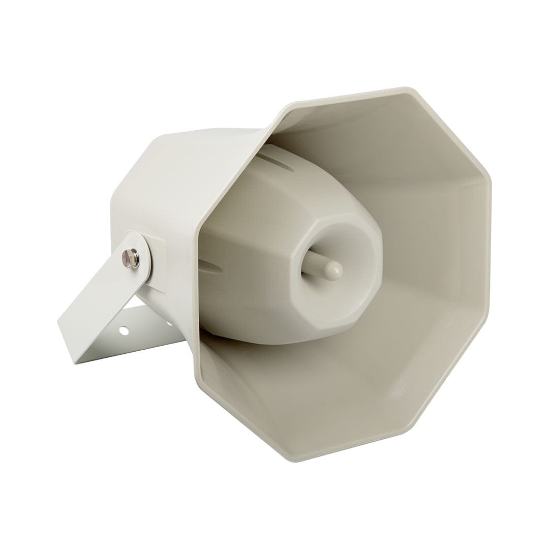 The H80 has a hexagonal horn flare with a round back cover. The horn flare and back cover are manufactured from weatherproof, hard-wearing ABS material. The securing wall bracket is metal and U-shaped with a powder coated finish.