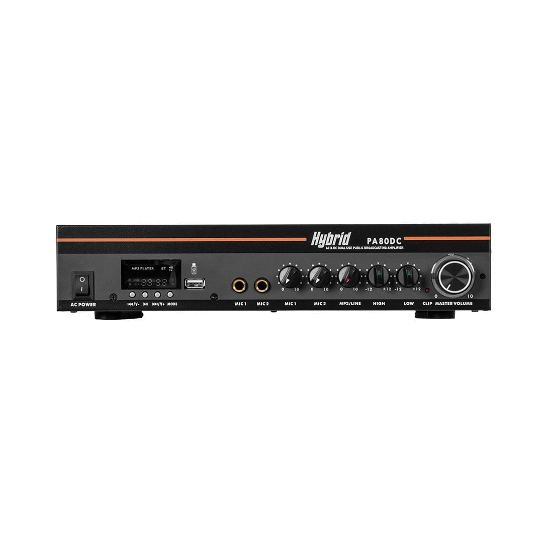 The Hybrid PA80DC is an entry level, well priced, mid format public address amplifier that can be powered by either 220V mains or a 12V DC battery / power supply. The PA80DC is most commonly used as a mobile public address amplifier in a vehicle connected to horn speakers.