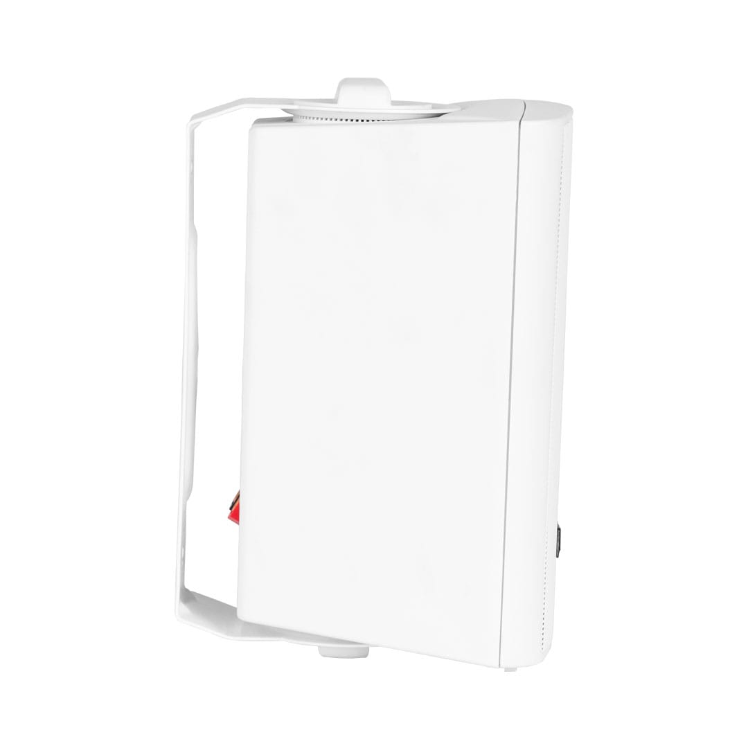 These speakers feature a full face grille and a modern ABS enclosed design. A U-shaped metal installation bracket, wall-mount securing hardware and a masonry drill bit are included.