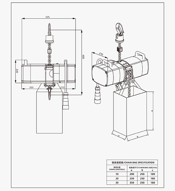 The hoist includes a 10 meter black electrophoretic coated chain: