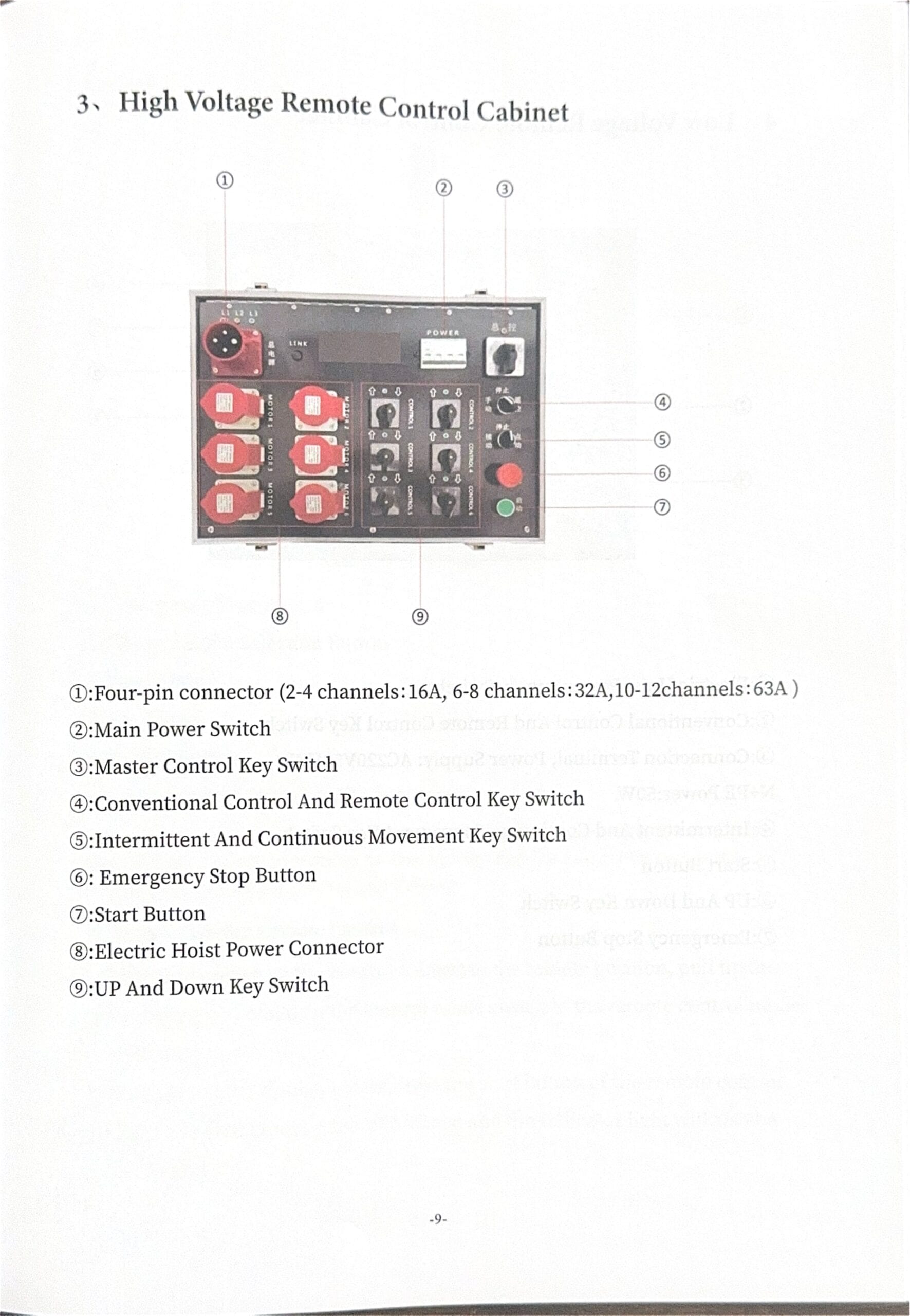 The High Voltage Remote Control Cabinet is a robust and reliable solution designed for safe and efficient control of electric hoists and lifting systems. Built for industrial, stage rigging, and event environments, this controller allows operators to manage multiple channels with precision, whether locally or via remote control.
