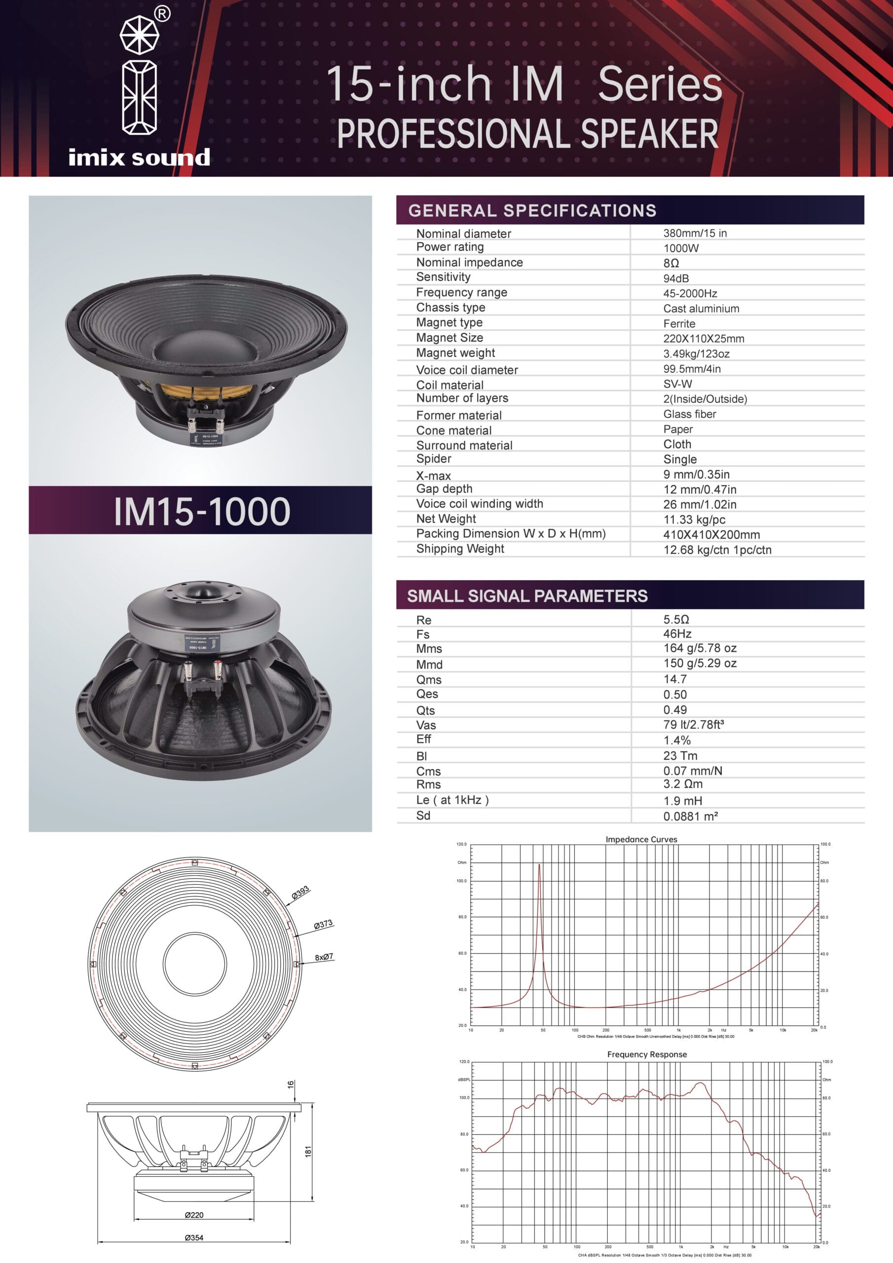 The Imix IM15-1000 is a professional-grade 15-inch loose speaker designed for high-power audio applications. With a robust 1000W power handling capacity and 8-ohm impedance, this speaker delivers deep bass, clear mids, and powerful sound reinforcement for live performances, DJ setups, and large-scale PA systems. Built for durability, the IM15-1000 features a high-efficiency woofer with a reinforced cone and high-temperature voice coil, ensuring reliable performance even under heavy use. Its rugged construction makes it suitable for touring and fixed installations, while the lightweight design (11.5 kg) enhances portability. Ideal for bass-heavy applications, this speaker provides exceptional low-frequency response and dynamic range, making it perfect for bands, nightclubs, and outdoor events. Pair it with a compatible amplifier for optimal performance and enjoy studio-quality sound with professional power.