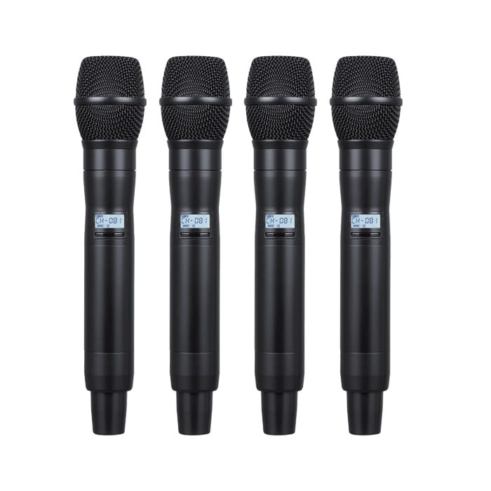 a professional solution designed for robust sound and versatility in any environment. This comprehensive wireless system includes four high-quality handheld microphones, making it perfect for multi-speaker events, stage performances, and studio recordings.