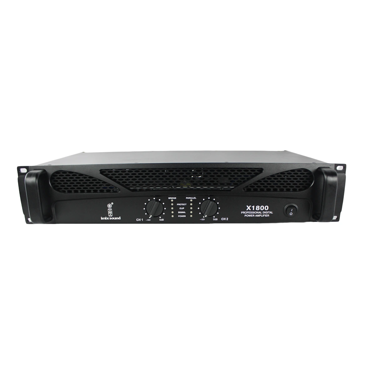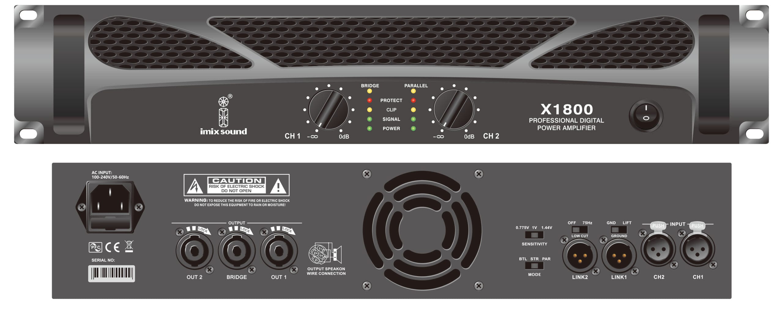 The Imix X1800 is a professional 2-channel power amplifier designed for high-efficiency audio performance. It delivers 600W per channel at 8 ohms and 1000W per channel at 4 ohms, with a bridged mode output of 2000W for added flexibility. Built with a Class D circuit, it ensures low distortion (THD <0.1%) and a wide frequency response of 20Hz–20kHz.