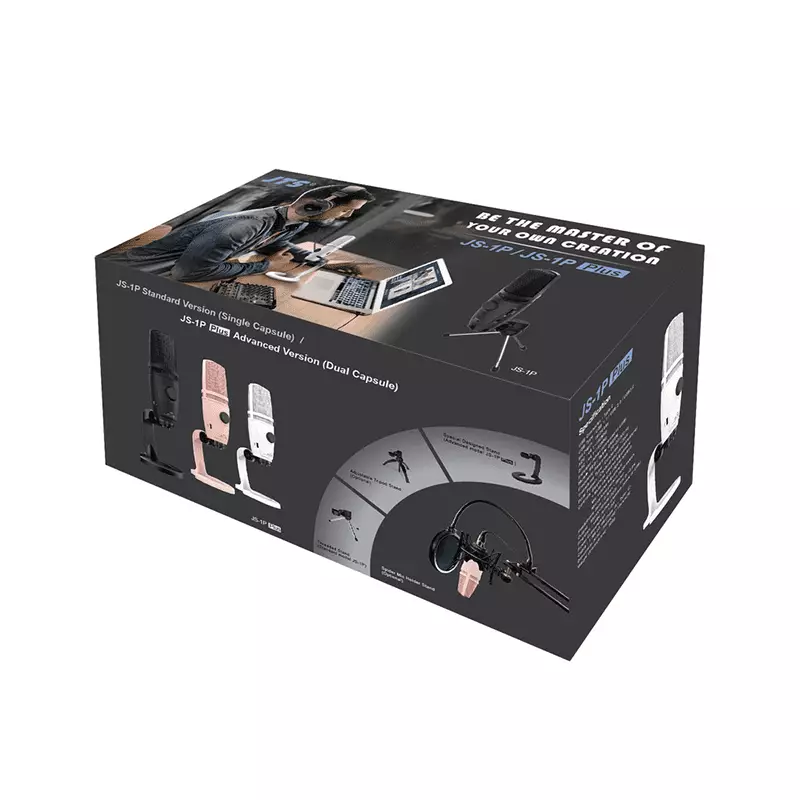 The JS-1P is a USB Condenser Microphone with a High Sensitivity cardioid pickup pattern that makes it perfect for Podcasts, on-line video calls as well as live and recorded applications. It is supplied with a USB A-B cable together with a small threaded stand for desktop standing. The integrated headphone jack allows monitoring of the JS-1P microphone and the audio from the computer at the same time with a blend and volume control to mix the signals. The instant mute function allows for instantaneous muting of the microphone