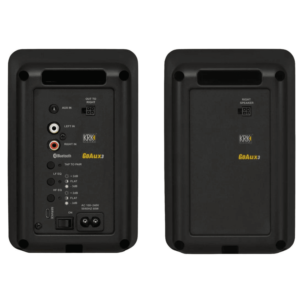 The rear-ported ABS cabinets are durable and supply surprising bass extensions for portable speakers. With the power amps located in one speaker’s housing and the second speaker powered through an included speaker-level connection from the first, the pair only needs a single AC outlet for operation. Built-in LF and HF EQ let you adjust the monitors’ response to the room and your personal preferences. Along with the 1/8” Aux and RCA stereo inputs, Bluetooth capability means you can connect wirelessly to your smartphone, computer, or other Bluetooth-capable audio devices. When you need to monitor silently, you can connect to the front panel 1/8” stereo headphone output, which automatically mutes the GoAux 3 speakers.