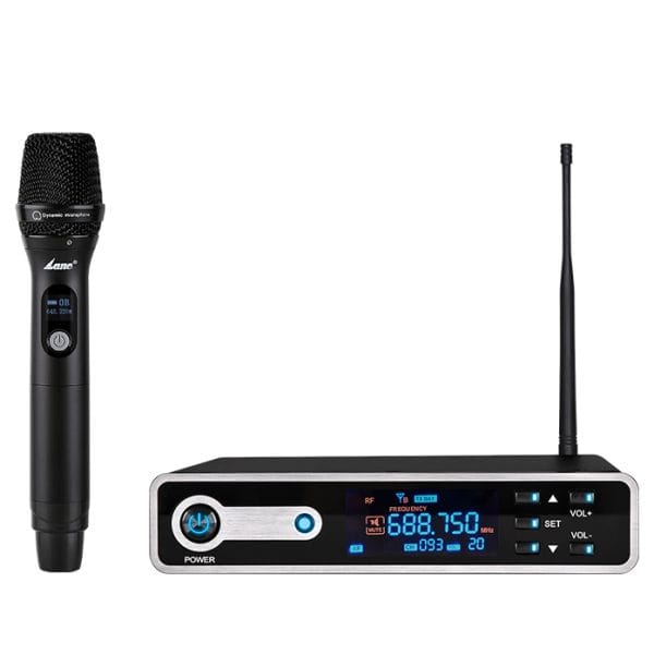 The Lane LR-661 is a wireless handheld microphone that can be used for karaoke, conferences, teaching, church, singing, and speaking. It has a hypercardioid polar pattern, LED lights, and is made of aluminum alloy and metal. The LR-661 has a frequency range of 640–690 MHz, a frequency response rate of 30–16 kHz, and a receive sensitivity of less than 108 dB. It also has a modulation mode of FM and a receive distance of more than 60 m