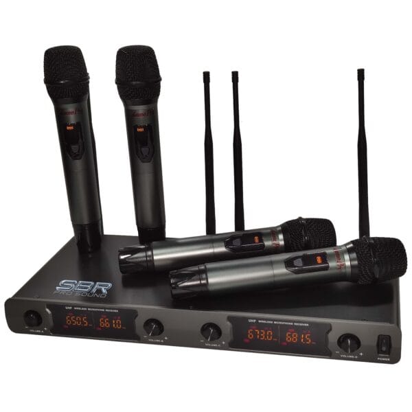 The Lane M604 system includes four wireless microphones, allowing multiple performers or speakers to use the system simultaneously.