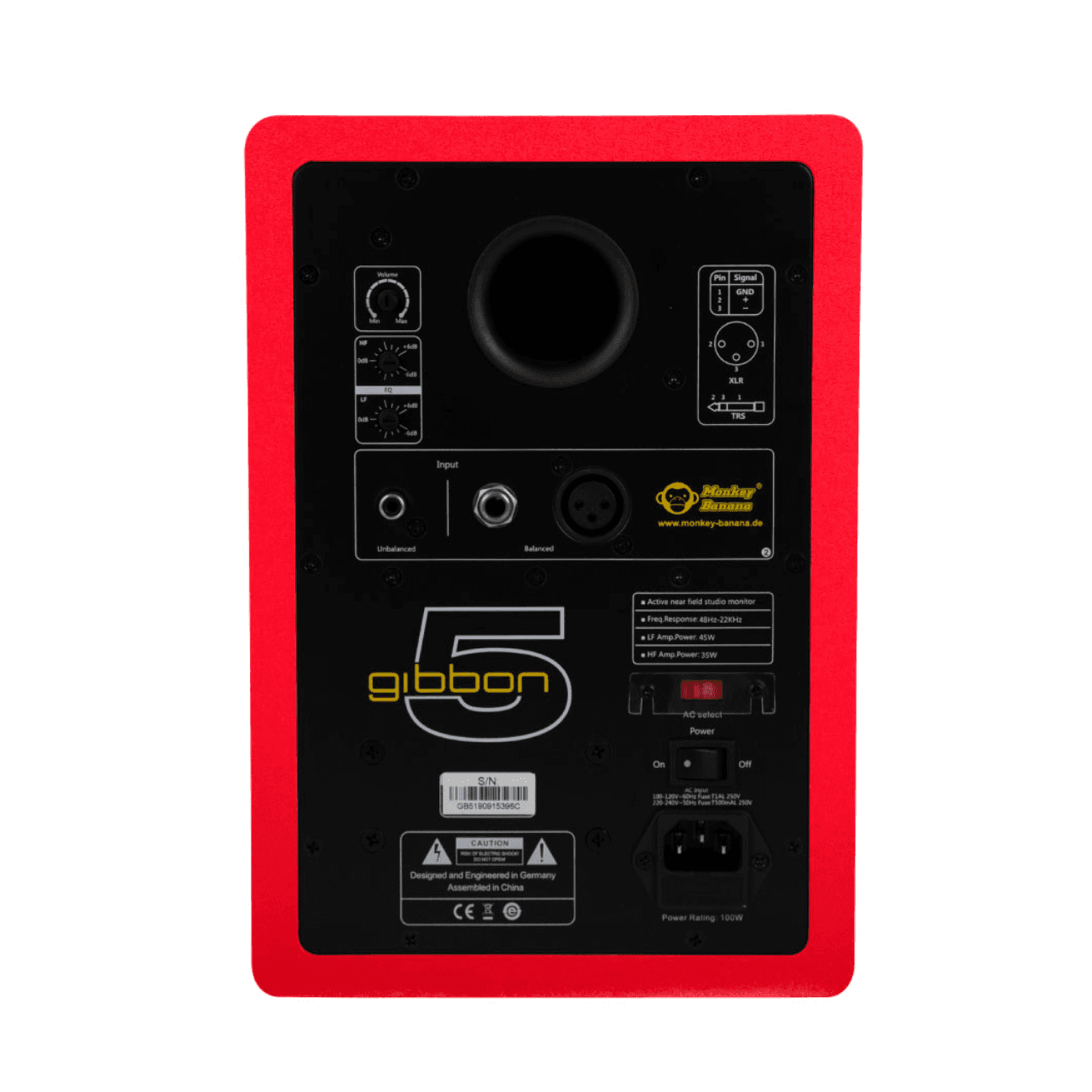 Monkey Banana Gibbon 5 is an active near field monitor for the ambitious home studio or for editing suites in broadcasting studios. With this digital bi-amp powered loudspeaker, you achieve perfect mixes in small scale monitoring environments.