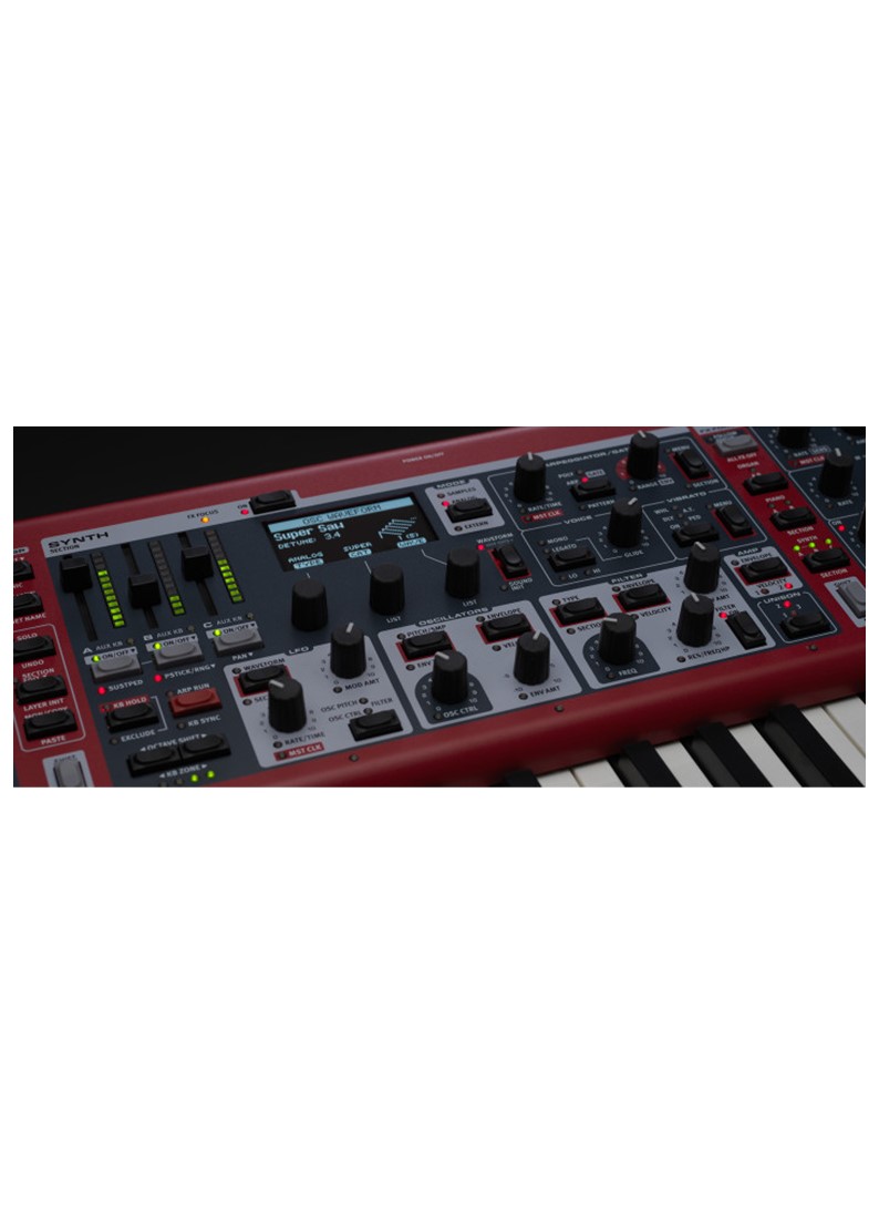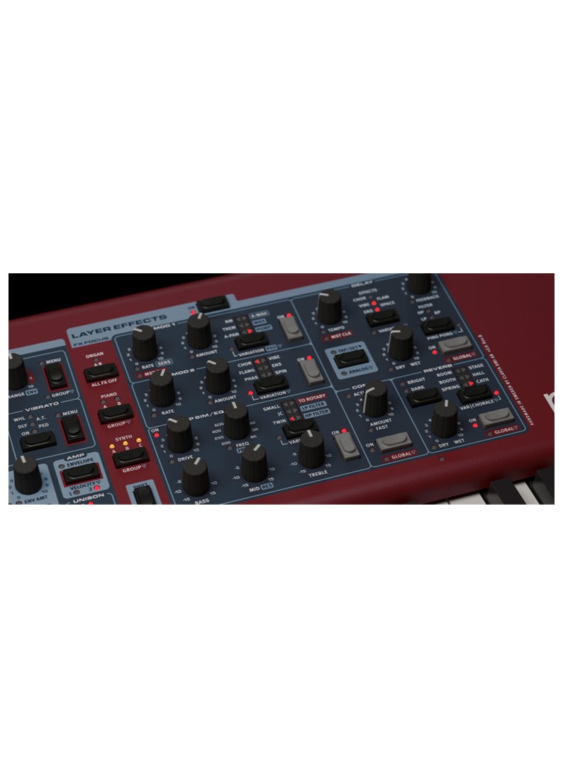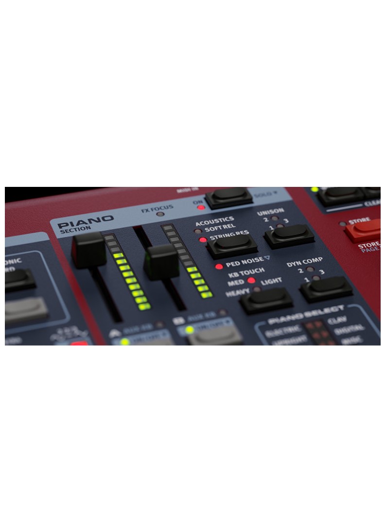 The Nord Stage 4 Compact introduces a new panel design that offers exceptional control and flexibility. The dedicated LED faders for each layer simplify sound adjustments and enhance performance ease. This design also includes a comprehensive preset library, enabling quick and seamless access to a wide range of sounds.