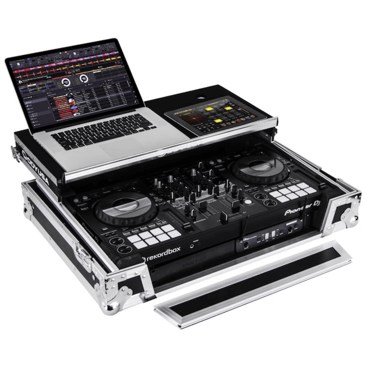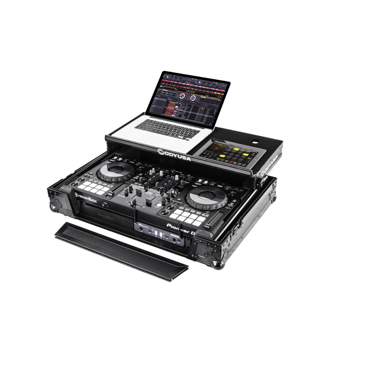 The Odyssey FZGSPIDDJ8001 Flight Zone® case includes a removable V-cut™ front panel allowing access to the all of the DJ controller’s front knob controls and input jack ports. It features Odyssey patented Glide Style™ platform perfect for positioning your laptop, tablet, effect processors, and other gear right where you want it over the Pioneer DDJ-800 or XDJ-RR rekordbox DJ controller. A cable management port, essential for a clean setup, is positioned below the rear of the player. Also Underneath the controller compartment is another one of Odyssey’s signature digital controller case designs; a 1U 19″ rack mount space below the controller space is perfect for rack mountable gear such as a wireless mic system, power strip, drive rack, pullout shelf, or storage drawer. The mounting hardware included allows for front or rear rack mounting and can be removed altogether if needed.