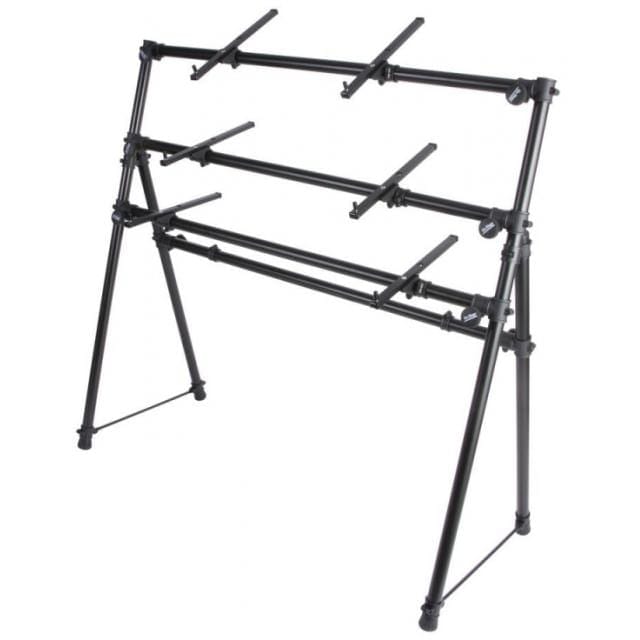This versatile A-frame keyboard stand lets you adjust the height and angle of your keyboards until they are just right for playing, whether you are standing or sitting. This lightweight, easy to carry, 54″ wide stand is an outstanding value for anyone with a multi-keyboard setup. Support bars slide from side-to-side on the pole, allowing a max 76-key keyboard. Also featured is 2 fixed positions for each support bar, allowing 2 sliding front and rear positions, as well as angle adjustments