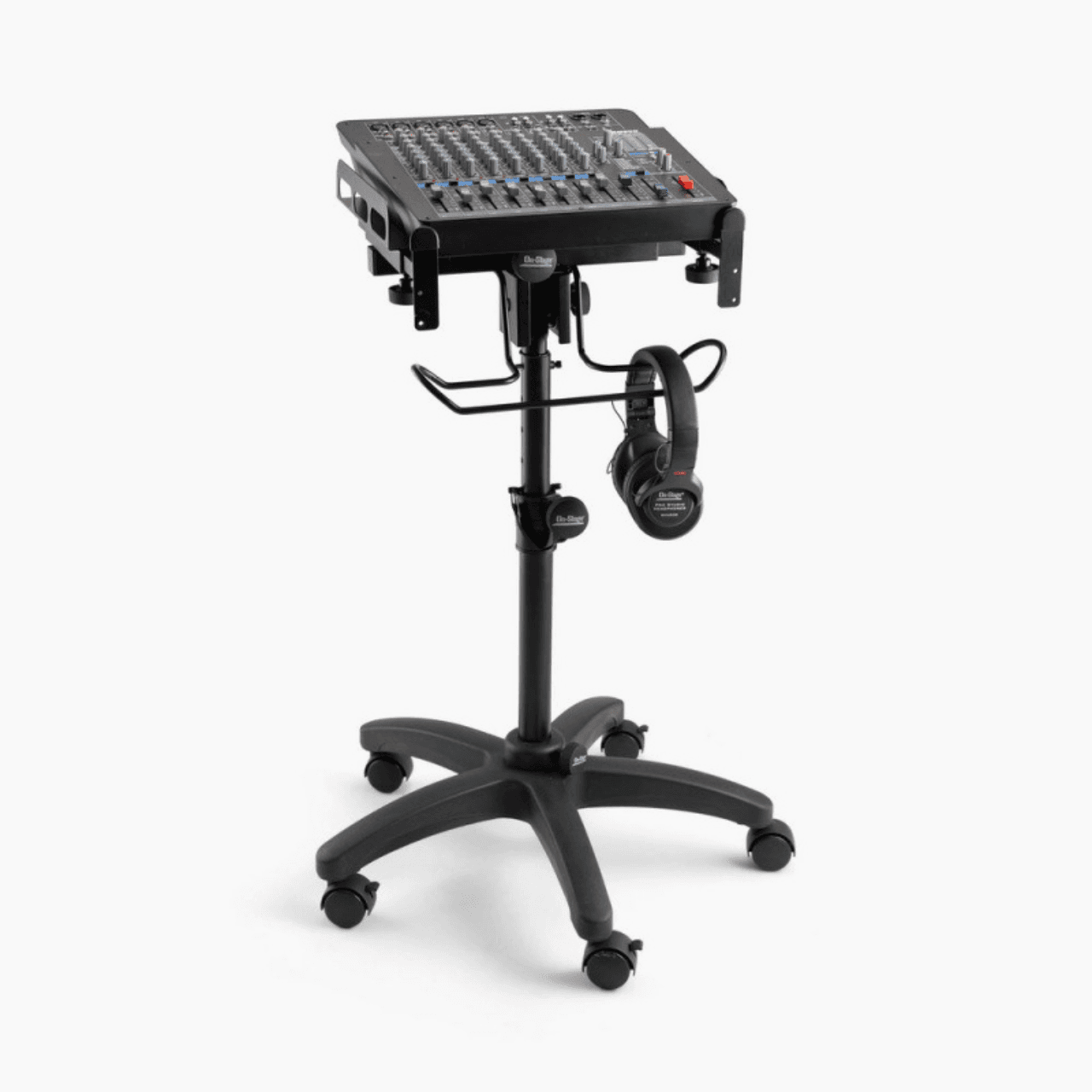 Our MIX-400 Mobile Equipment Stand provides sturdy, easy-to-move access to mixing or performance gear. The side rails and front bumper adjust to hold equipment of various sizes firmly in place. Adjustable height and tilt angle enable positioning of the device for comfortable operation. Heavy-duty construction and five base legs deliver balance and stability to reliably support gear. For ease of movement and precise placement, the base rolls on casters that can lock for stationary use. Features a headphone hanging rack for storage of headphones or cables. Simple storage and transportation, the stand disassembles into three pieces.
