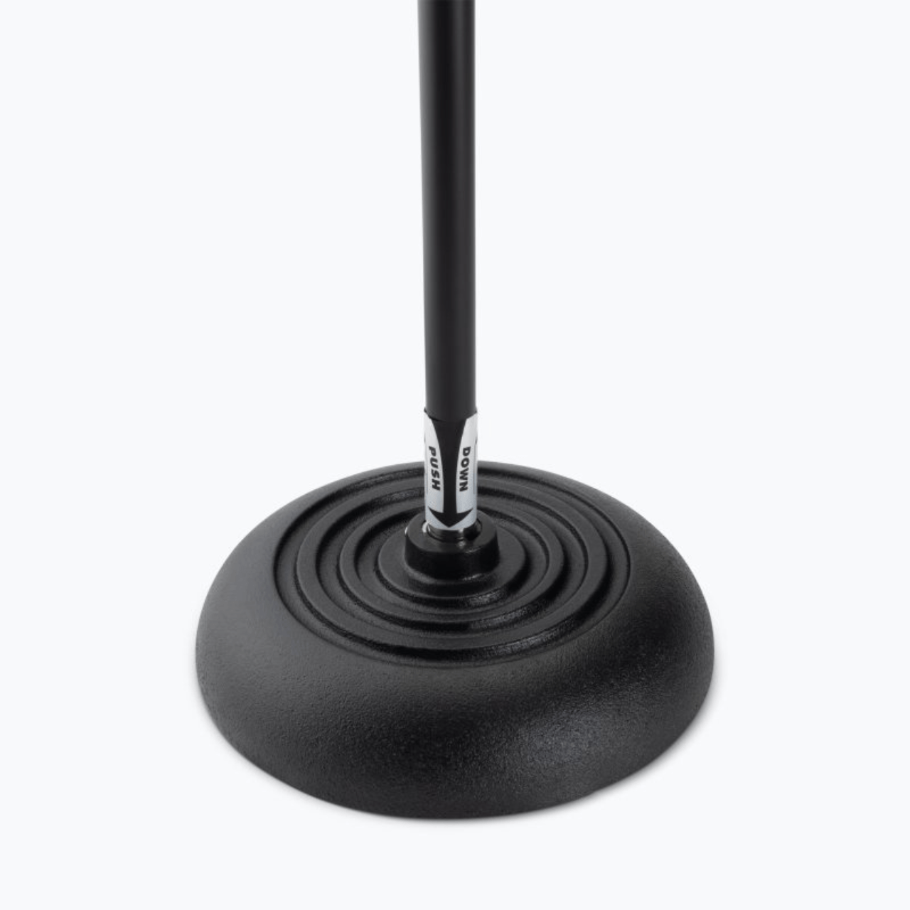 Our MS7201QTR Quarter-Turn Round-Base Mic Stand increases the efficiency of screwing a mic stand shaft into its base. To form a connection, simply push down the lower shaft and rotate it a quarter turn clockwise to lock, or push down and rotate it a quarter turn counterclockwise to release. The height-adjustable upper shaft accepts mic clips, booms, and other accessories. Its heavy yet portable round base delivers exceptional stability and withstands demanding conditions. Rubber padding on the bottom of the base reduces vibrations and prevents unwanted slipping. The whole stand is available in two colors to complement the style of various performance spaces.