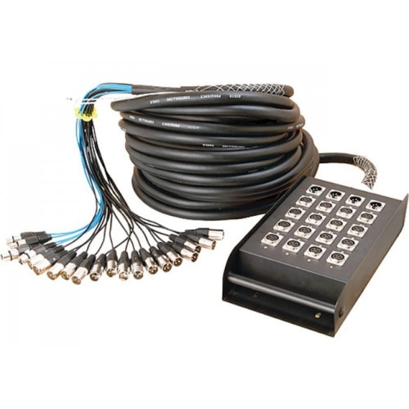 This 100’ 12×4 Stage Box provides 12 (XLR) female input channels plus 4 (XLR) male returns. All inputs and returns feature locking connections for a secure fit. Each connector is hand soldered and individually insulated to prevent electrical shorts even after years of use. Features include quick-release connectors, well-protected and flexible cable bundling, and a heavy-duty all metal chassis box. Comes with a built-in easy carrying handle and protective black nylon bag.