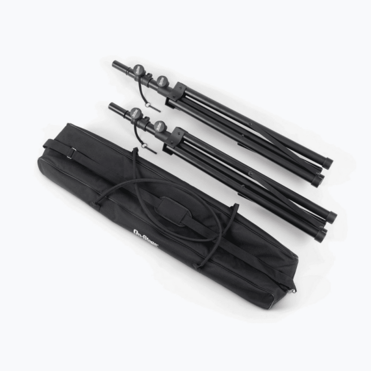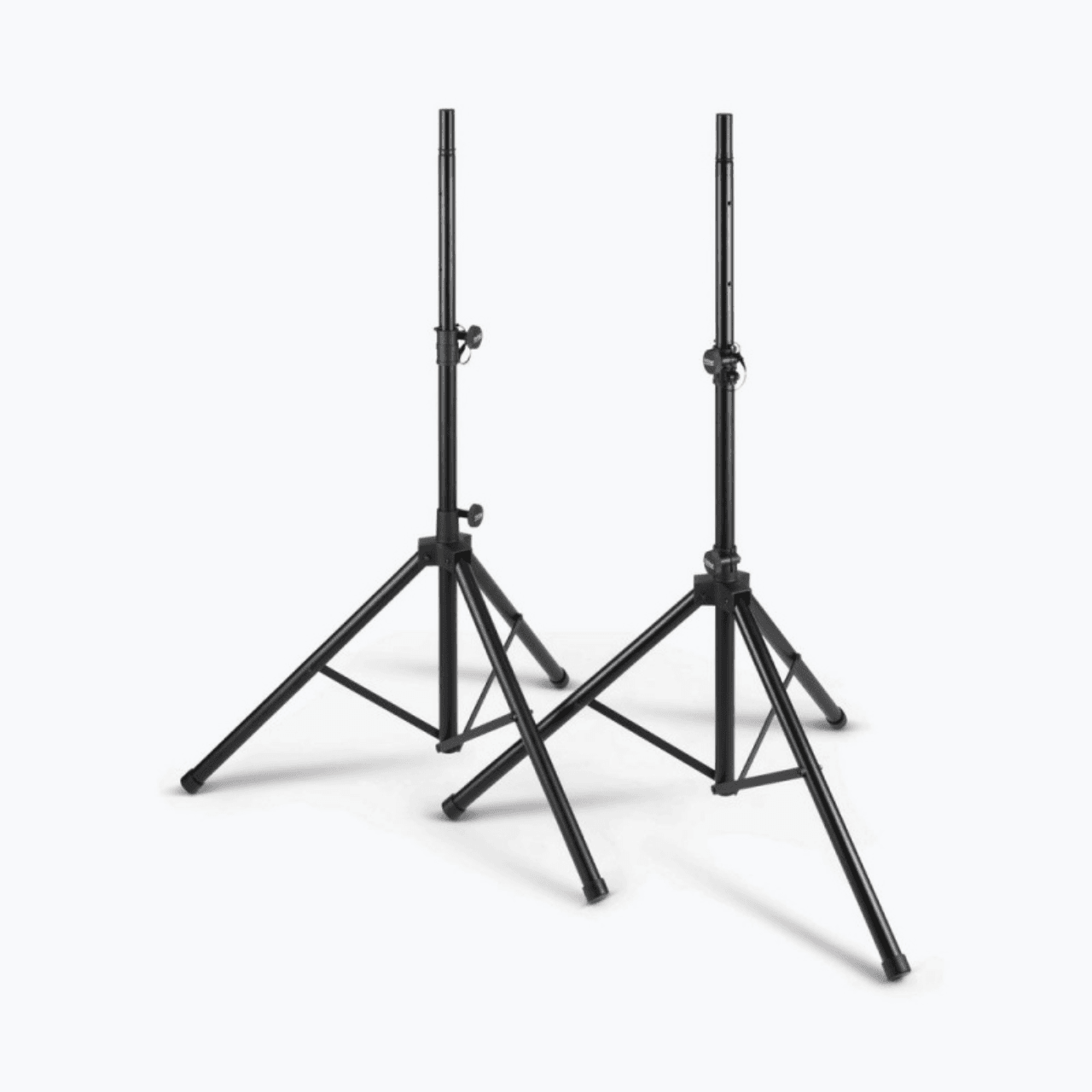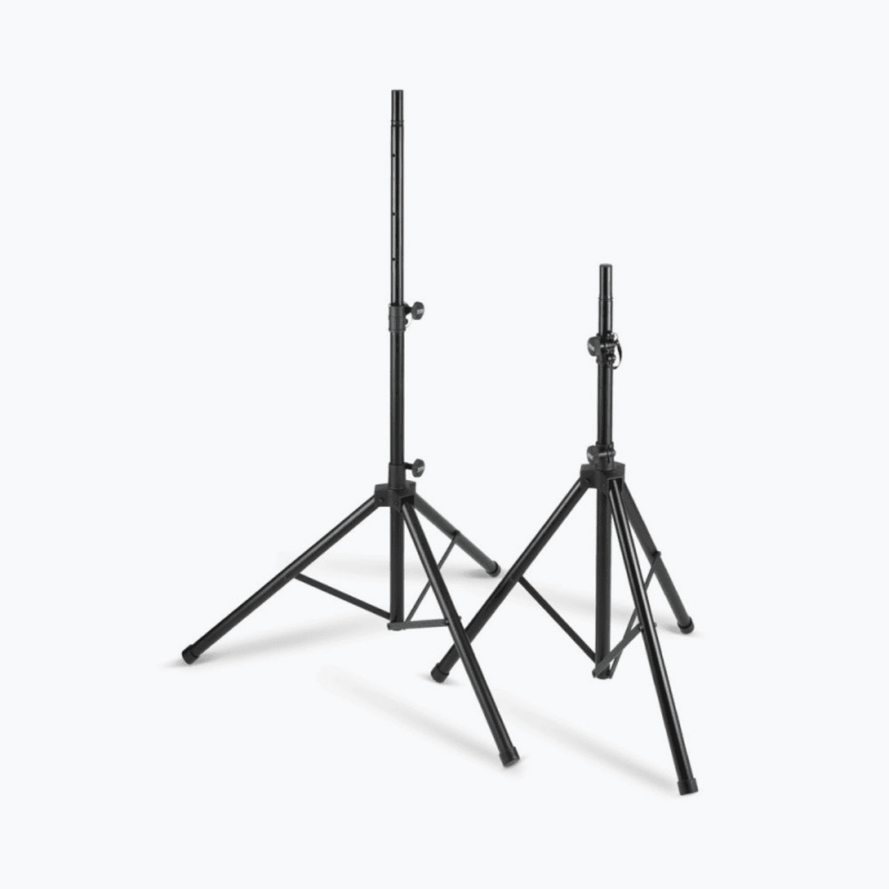 Our lightweight SSP7950 All-Aluminum Speaker Stand Pack comes with everything needed to support two speakers on individual stands. These lightweight stands feature versatile reversible poles that support all standard speaker cabinet mounting sockets, and their height adjusts to accommodate a variety of applications. Heavy-duty construction, braced bases, and nonslip feet work together to deliver exceptional stability and load balance, even on irregular surfaces. The durable black finish preserves the professional appearance of any space. For convenient storage and ergonomic transportation, the tripod bases fold flat, and all the components fit into an included carrying bag with a shoulder strap and top handles.